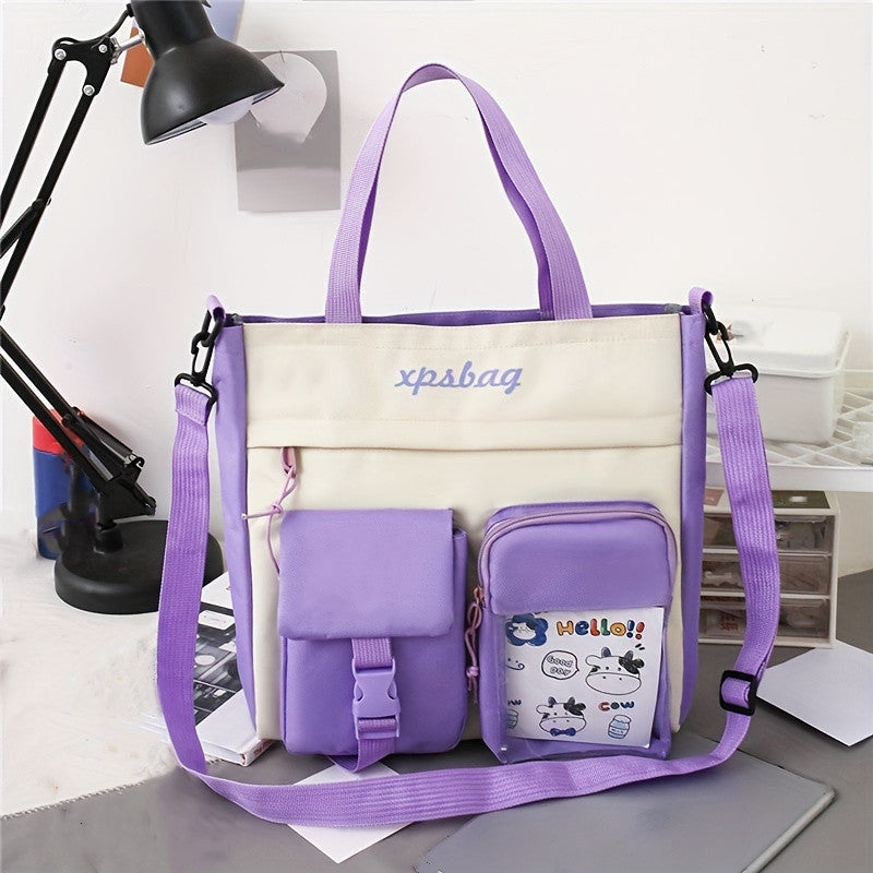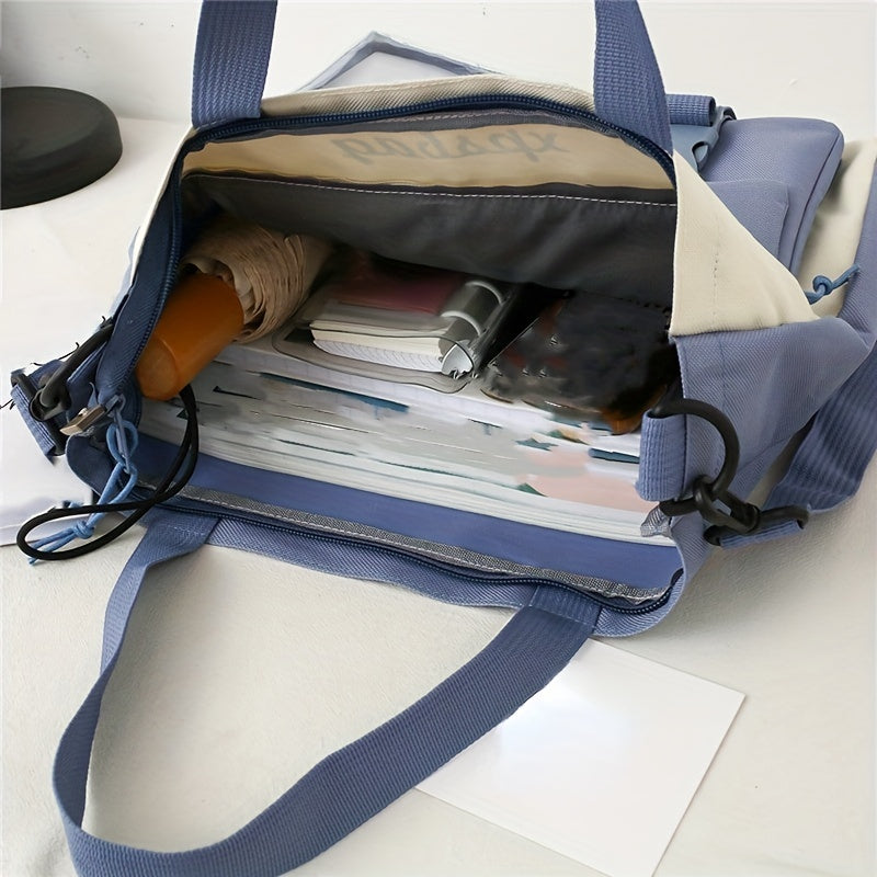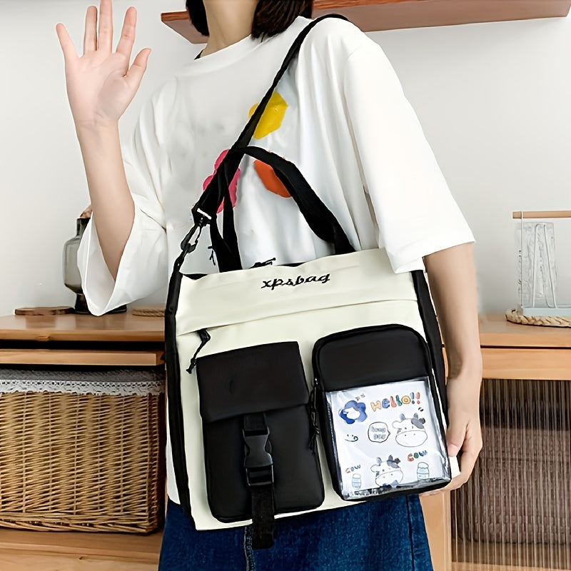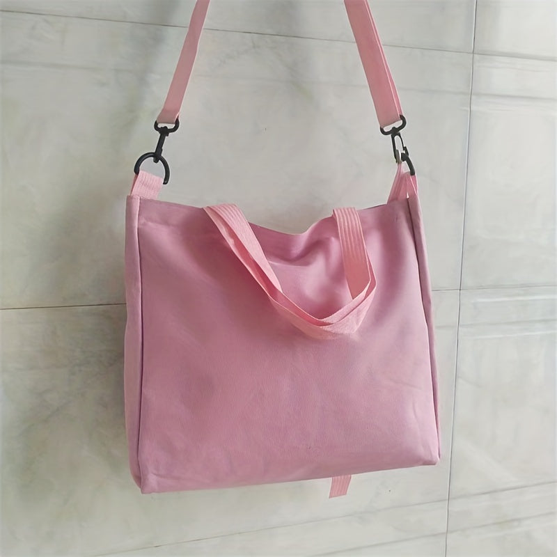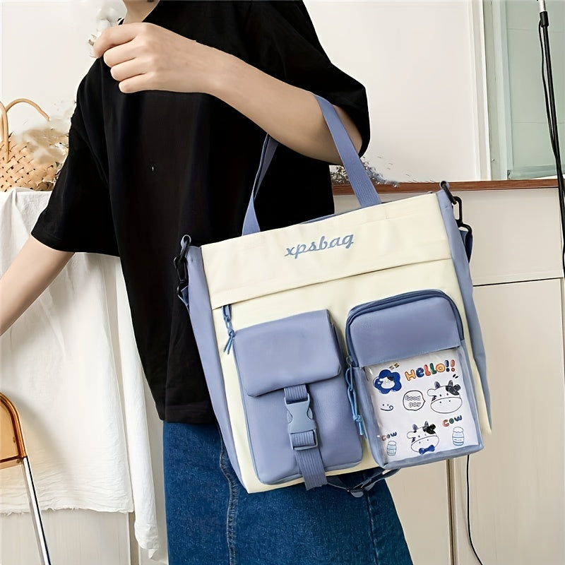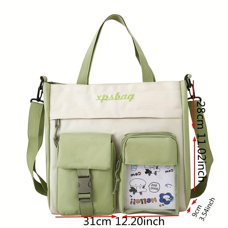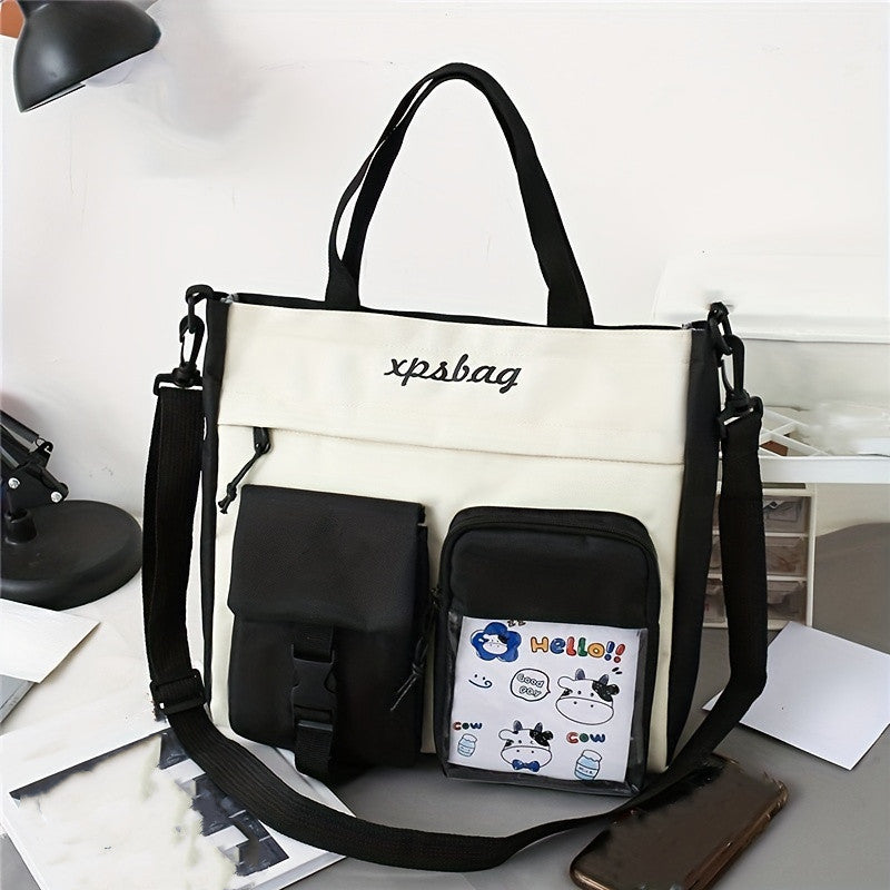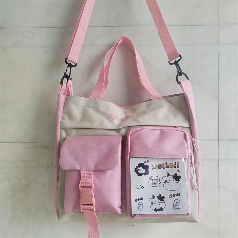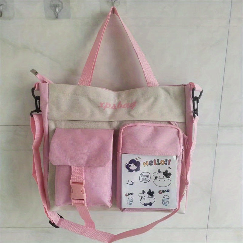 Front Pockets Canvas Hand Bag, Shoulder Crossbody Zipper Bag With Cute Pattern For Student