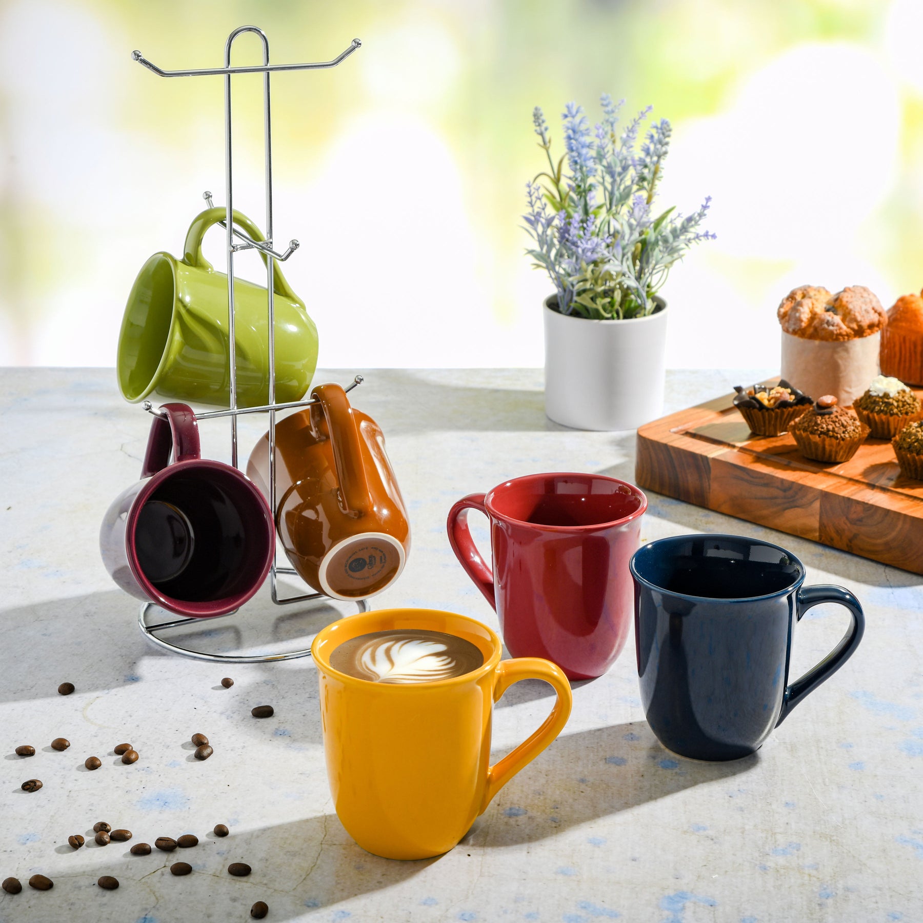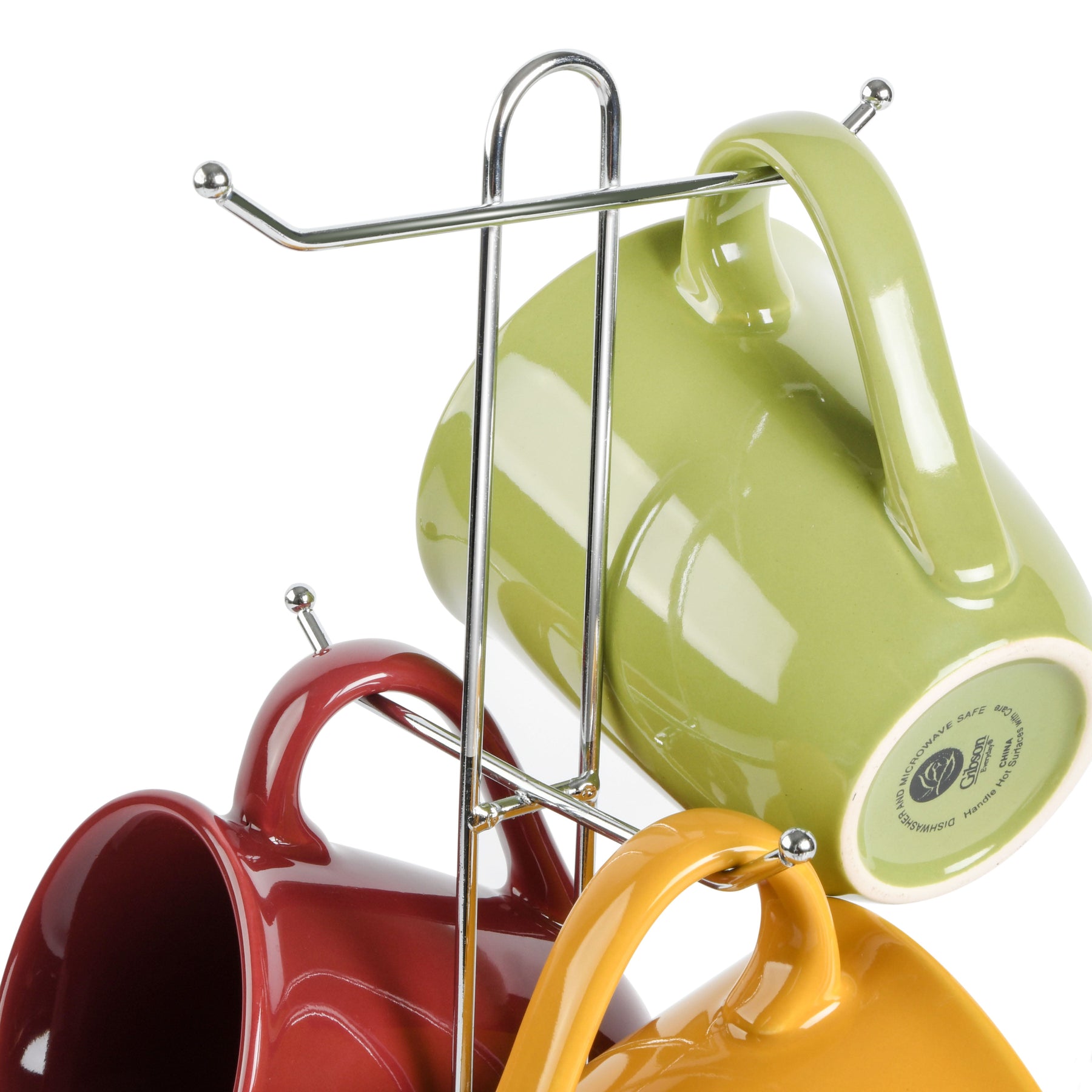 Sip in style with the Gibson Home Everyday Contempo Hues 15-oz Mug Set with a Rack. It includes pieces in the following colors: yellow, orange, red, peach, blue, and green. This six-piece stoneware mug set comes with a sleek and sturdy metal rack to store and display the mugs on your countertop. It is ideal for large households, or for entertaining friends and family. With its elegant and cheerful colors, the Gibson Home Everyday mug set can add a splash of style to any kitchen. They are ideal for everyday use and are microwave and dishwasher safe. These beautiful and classic mugs are sure to brighten up any morning.