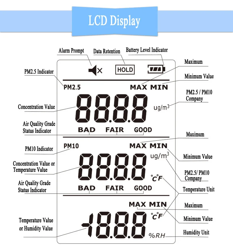 5. Many function, maximum/minimum display, data saving function, sound and light alarm settings and LCD backlight display.