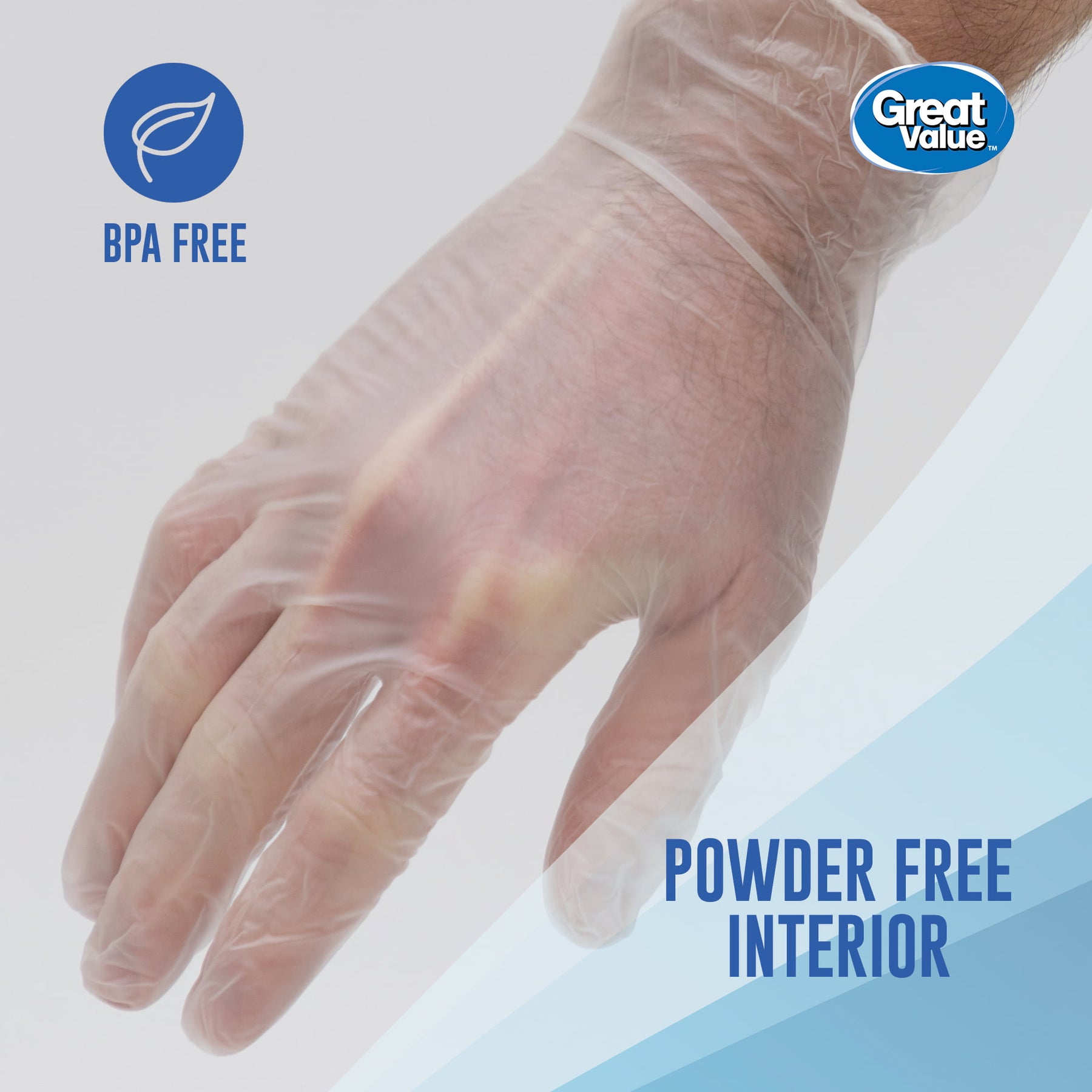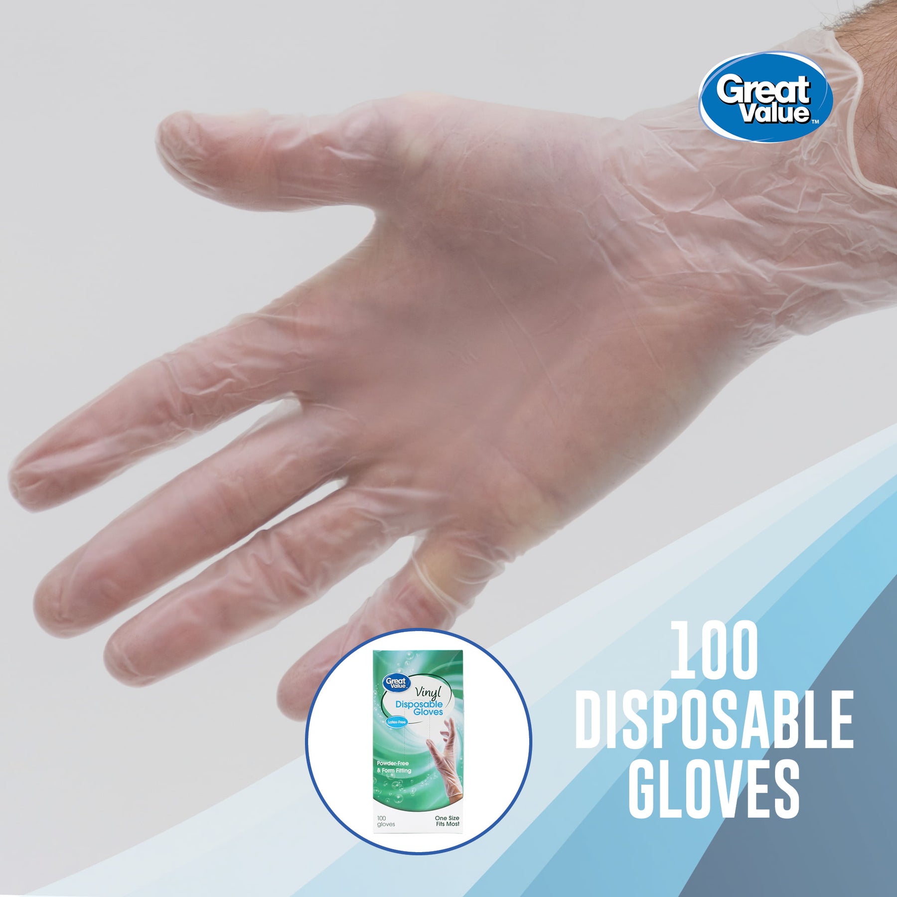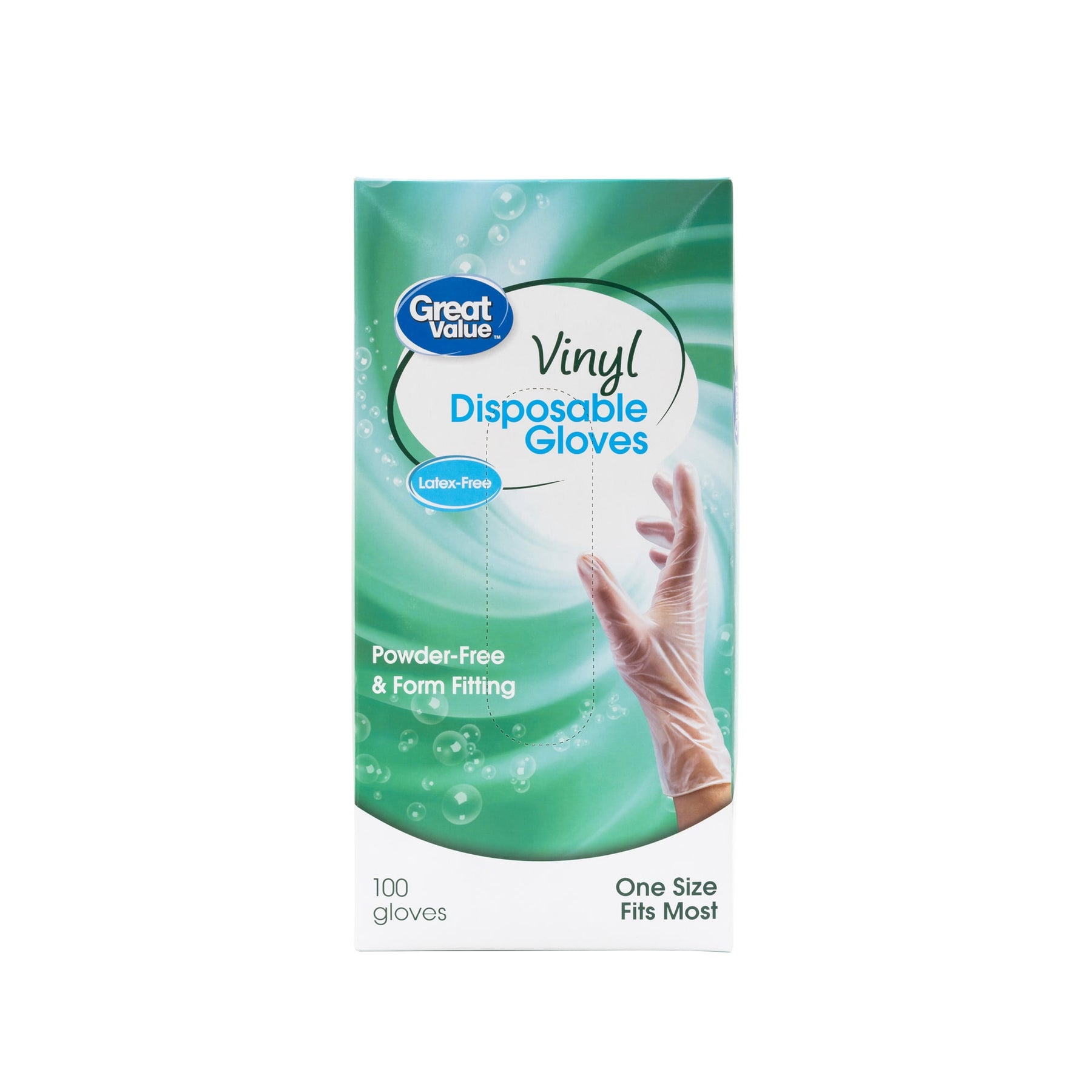 Great Value Disposable Vinyl Gloves, 100 count, are a multi-purpose, durable set of gloves that are ideal for activities that require frequent glove change. These gloves are transparent, powder-free and form-fitting. Vinyl is made from PVC and can be used by people sensitive to latex. Use them for non-medical activities that require protection for your hand, like sanitation, beauty, food processing and more.