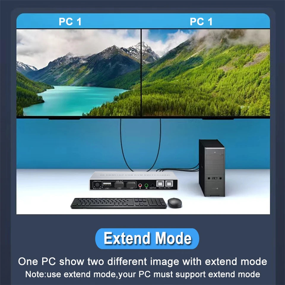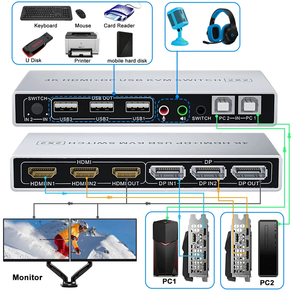2 In 2 Out 4K USB 2.0 HDMI Displayport KVM Switch Box dual monitor for 2 PC Sharing Keyboard Mouse Printer Plug Play Video 2 Display USB Switch Splitter