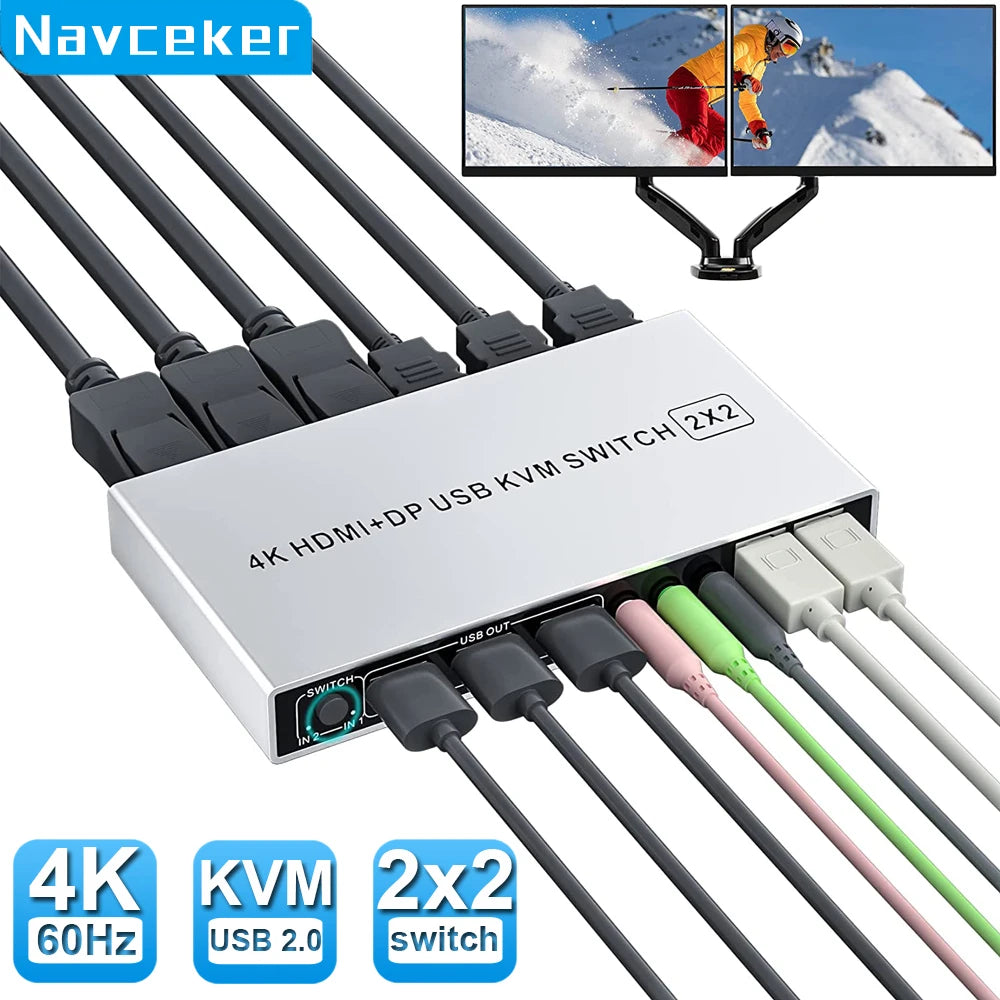 ZY-AHDK2,Navceker 4K 60Hz HDMI Displayport USB KVM Switch allows you to share one USB keyboard, USB mouse, and one HDMI monitor and one DP monitor to control 2 computers, laptops, game consoles.