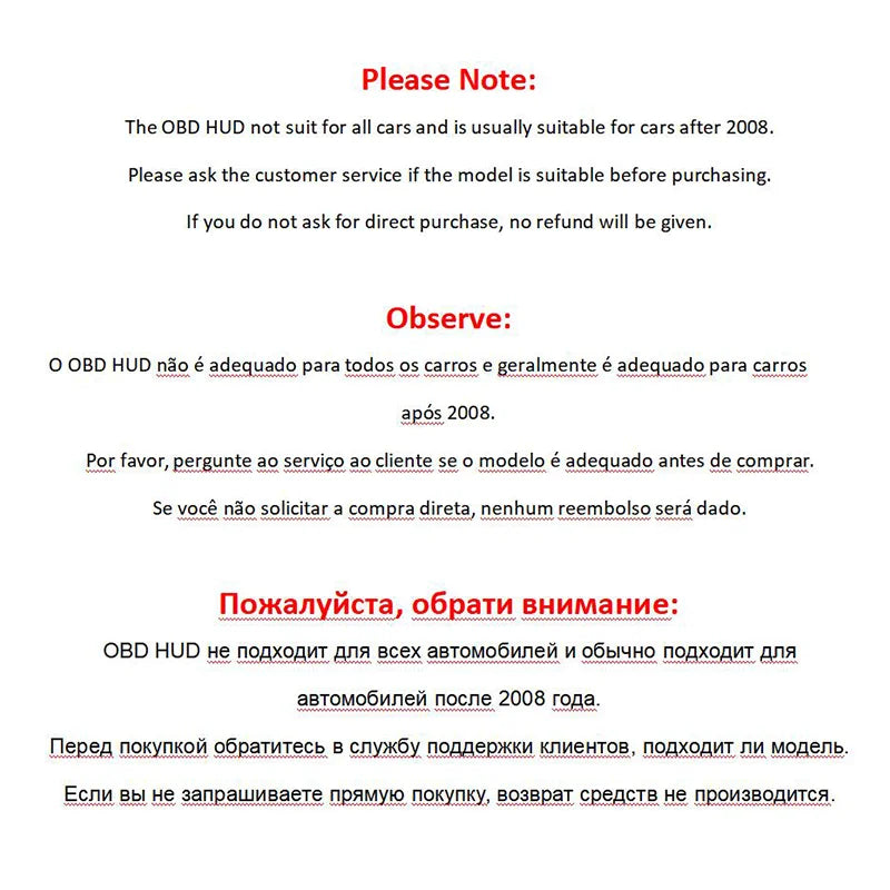 The OBD HUD not suit for all cars and is usually suitable for cars after 2008.Please ask the customer service if the model is suitable before purchasing.If you do not ask for direct purchase, no refund will be given.