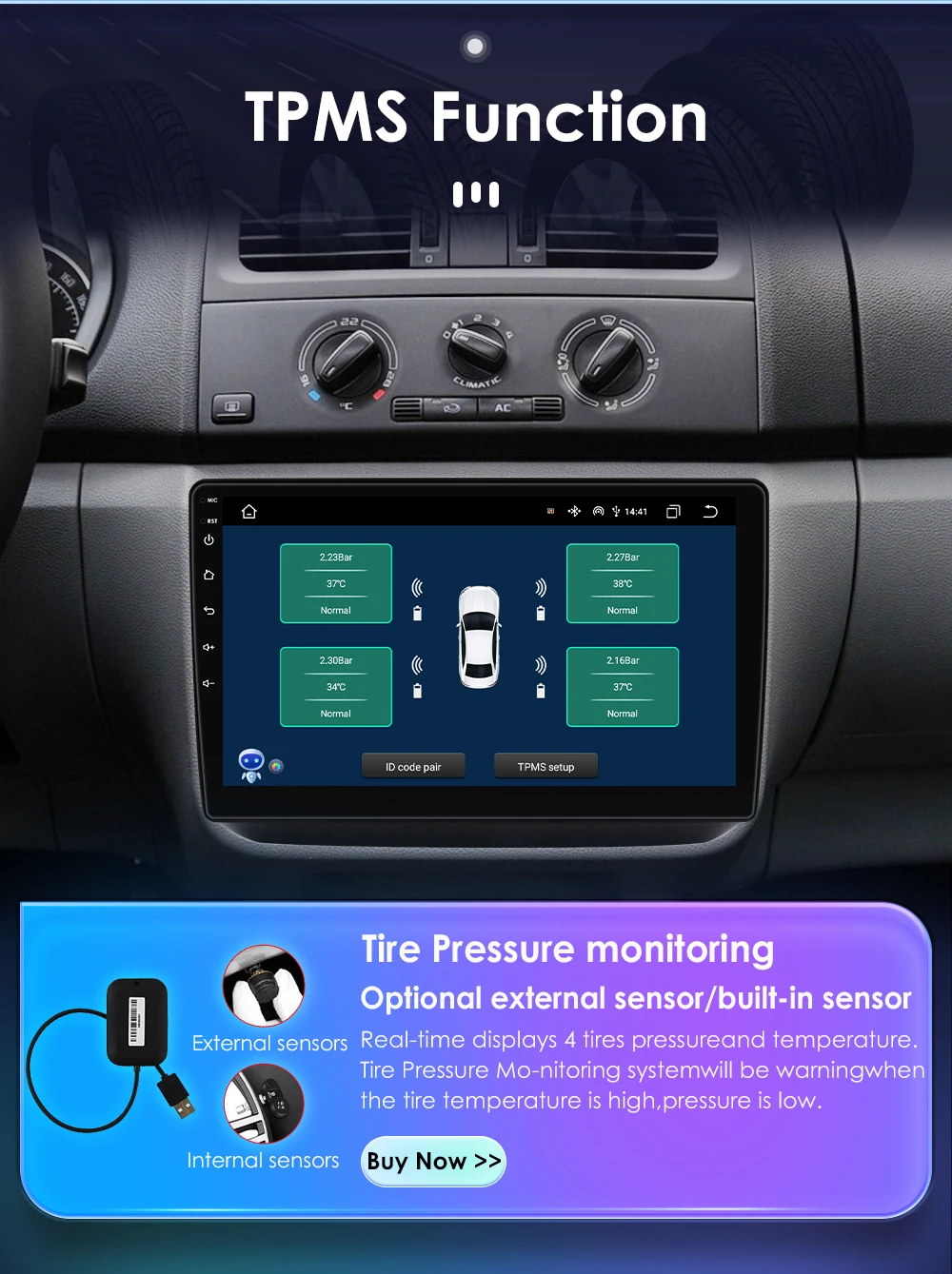 TPMS Function( Needs to order separately) : Tire Pressure Monitoring: Real-time displays 4 tires pressure and temperature,Tire Pressure Monitoring system will be warning when the tire temperature is high, pressure is low.