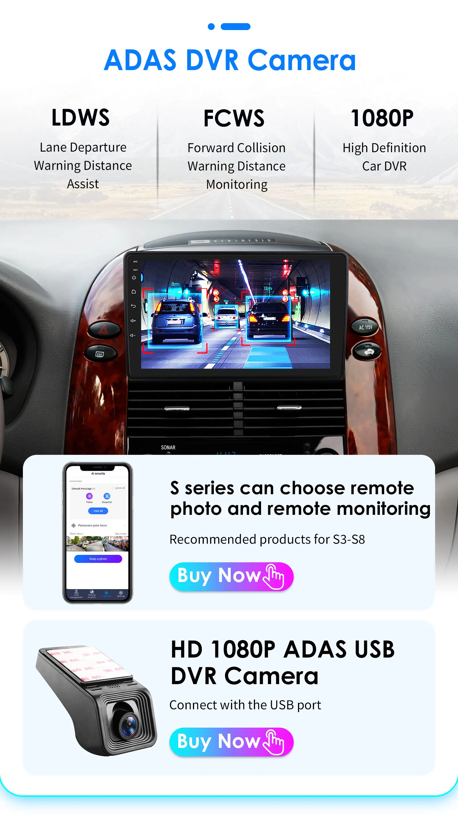HD 1080P ADAS DVR Camera(Needs to order separately) --connect with the USB port: LDWS(Lane Departure Warning Distance),FCWS(Forward Collision Warning Distance), 1080P(High Definition Car DVR).