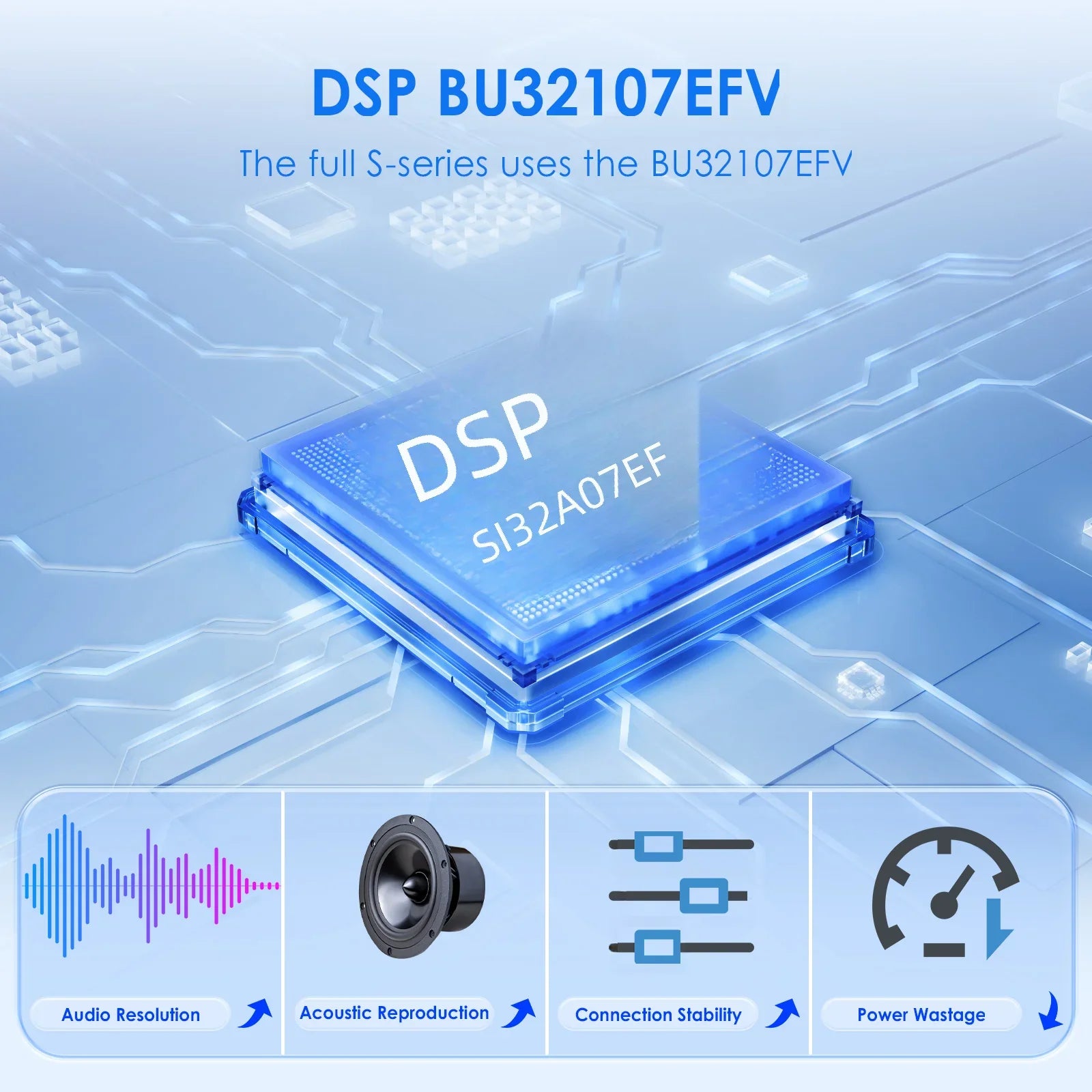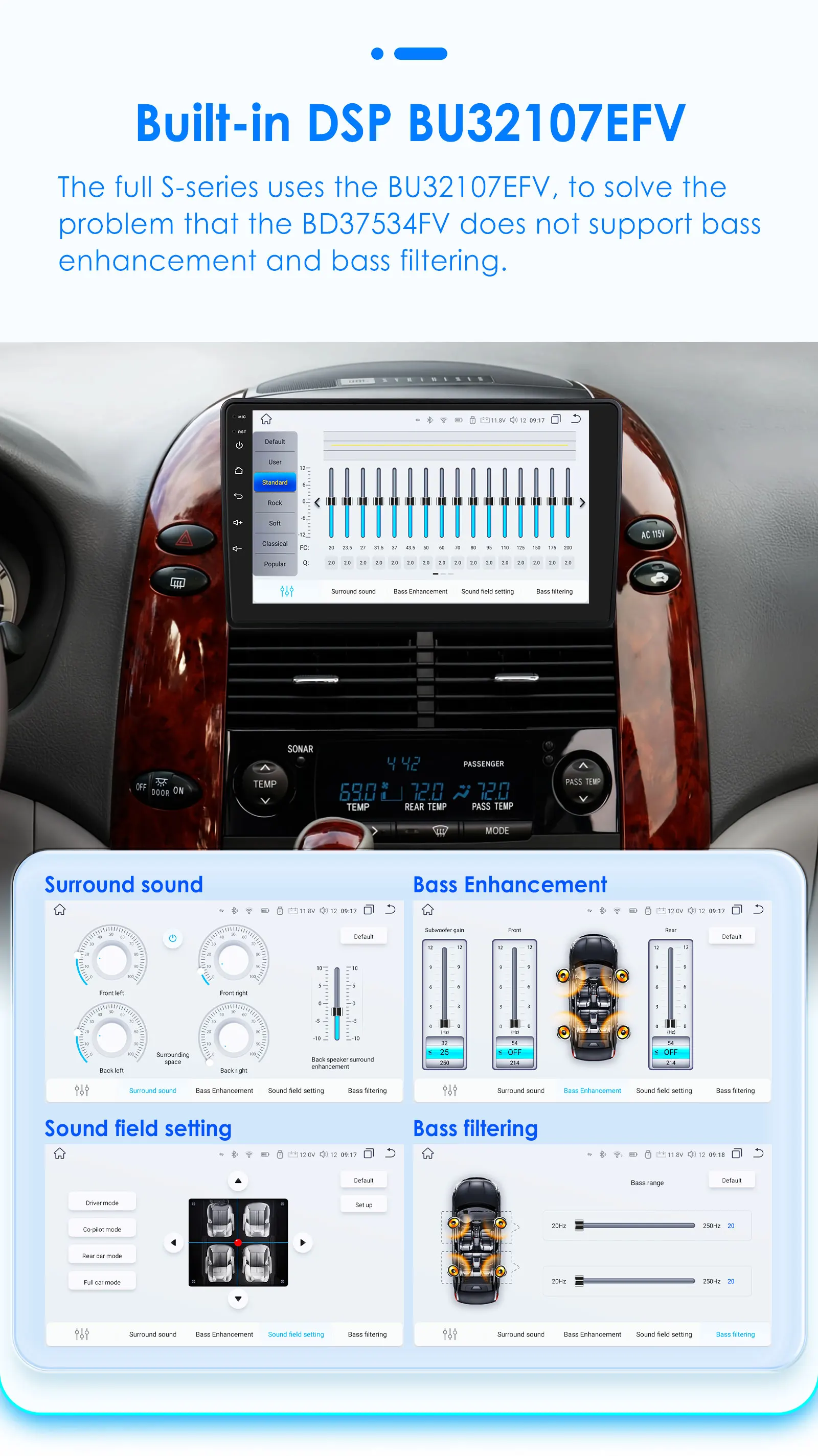Built-in DSP BU32107EFV: We use BU32107EFV and BD37534FV DSP IC in different configurations products. The specifit difference please refer to the product configurations table.
