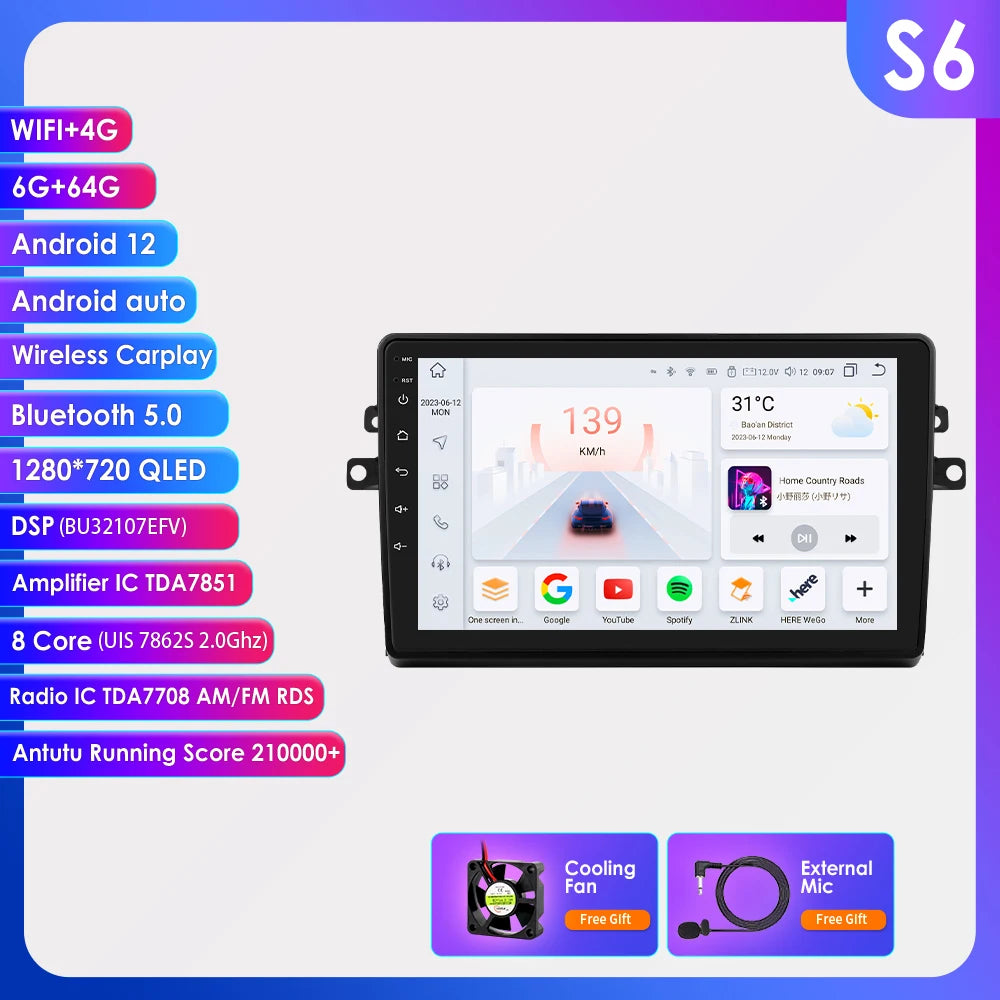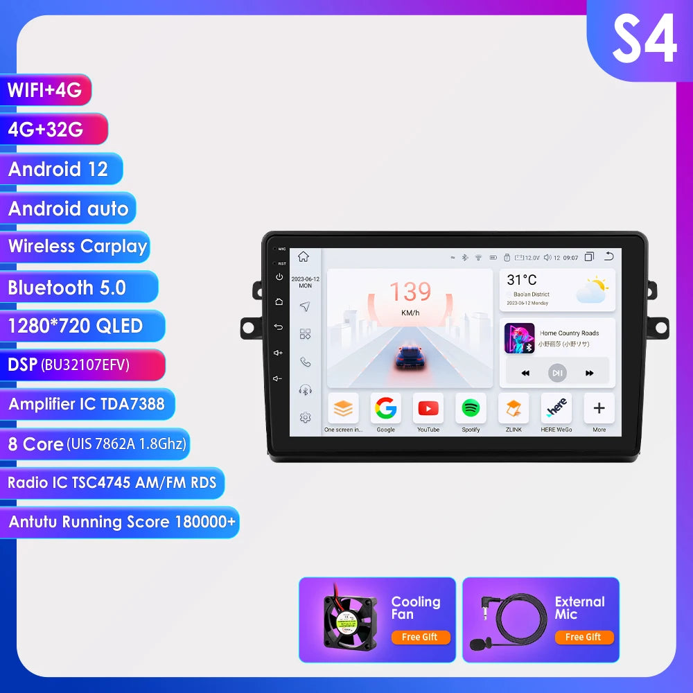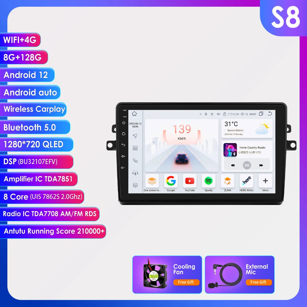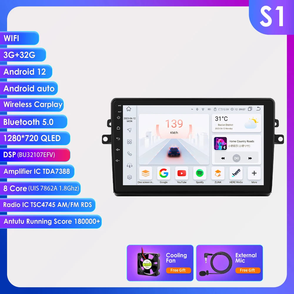 -----> Basic functions: Android 12 + 9 inch / 10.33 inch Display Screen + Quad Core 1.2GHZ (Eight core UIS 7862A 1.8Ghz / UIS 7862S 2.0Hhz optional)+ DDR3 1GB Flash (2GB/3GB/4GB/6GB/8GB optional) + 16 GB Memory (32GB/64GB/128GB optional) + WIFI (4G Network optional)+ Mirror link+ Steering Wheel Control + RDS+DSP(optional)