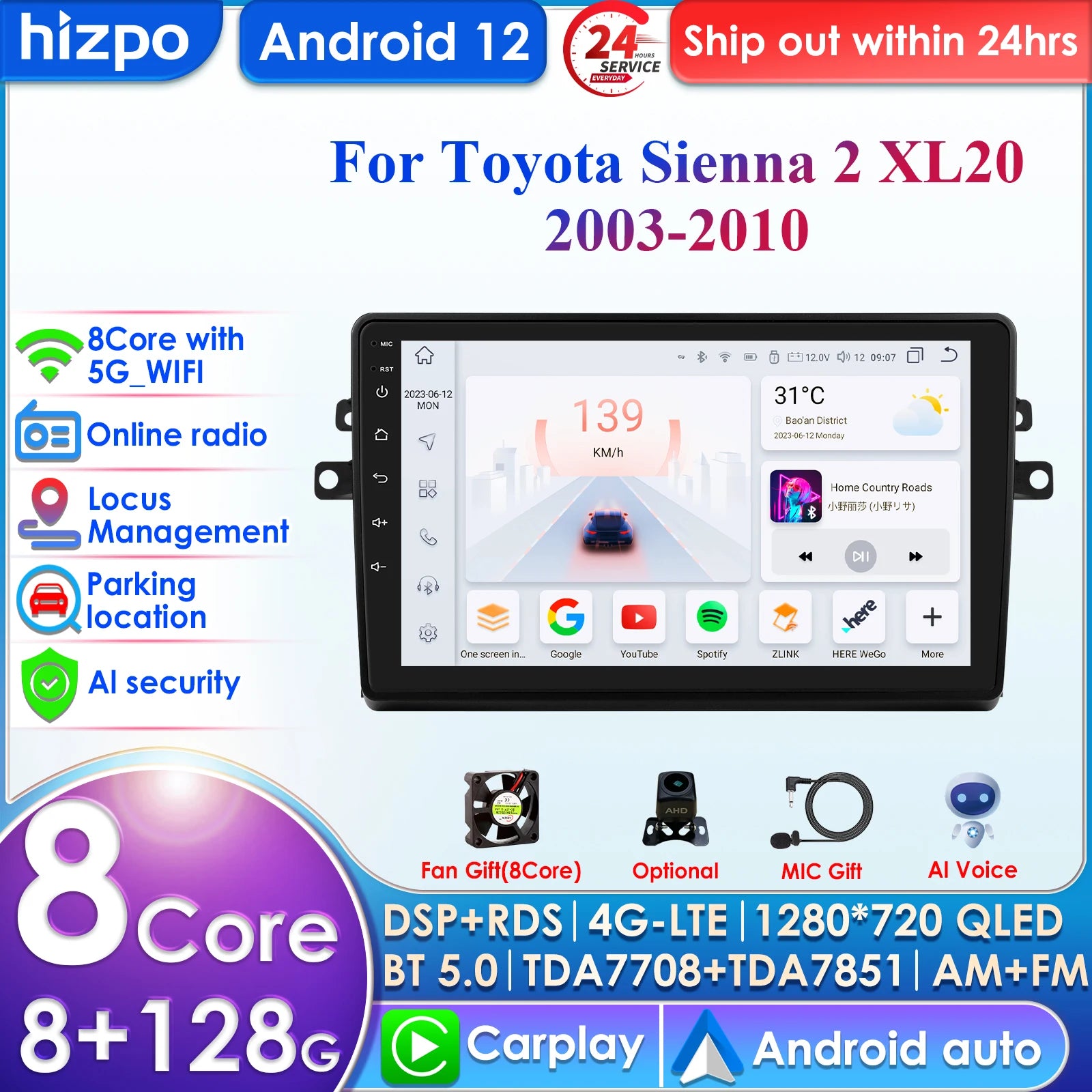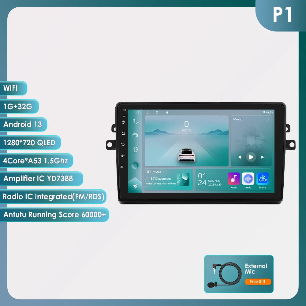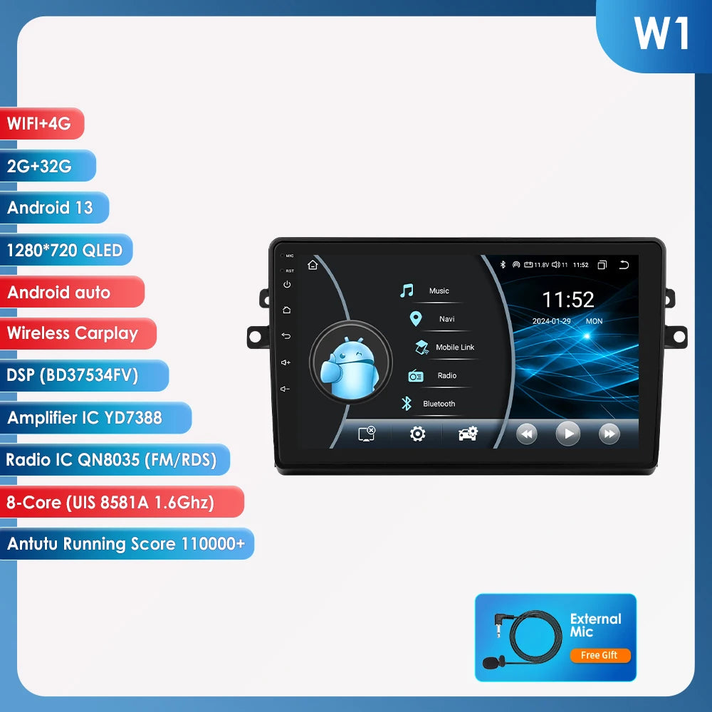 -----> Basic functions: Android 12 + 9 inch / 10.33 inch Display Screen + Quad Core 1.2GHZ (Eight core UIS 7862A 1.8Ghz / UIS 7862S 2.0Hhz optional)+ DDR3 1GB Flash (2GB/3GB/4GB/6GB/8GB optional) + 16 GB Memory (32GB/64GB/128GB optional) + WIFI (4G Network optional)+ Mirror link+ Steering Wheel Control + RDS+DSP(optional)