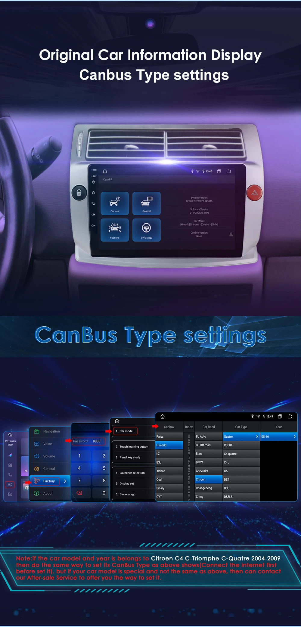 S seires Canbus Type settings: Factory--8888(Password)--Car Model--Hiworld--Citroen--Quatre-- 08-16--OK.
