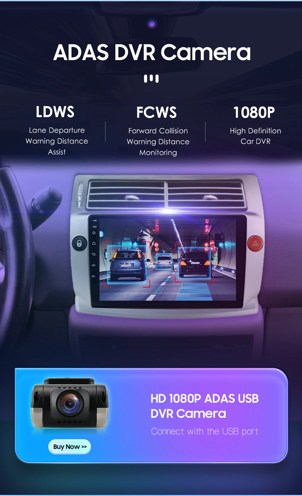 HD 1080P ADAS DVR Camera(Needs to order separately) --connect with the USB port: LDWS(Lane Departure Warning Distance),FCWS(Forward Collision Warning Distance), 1080P(High Definition Car DVR).