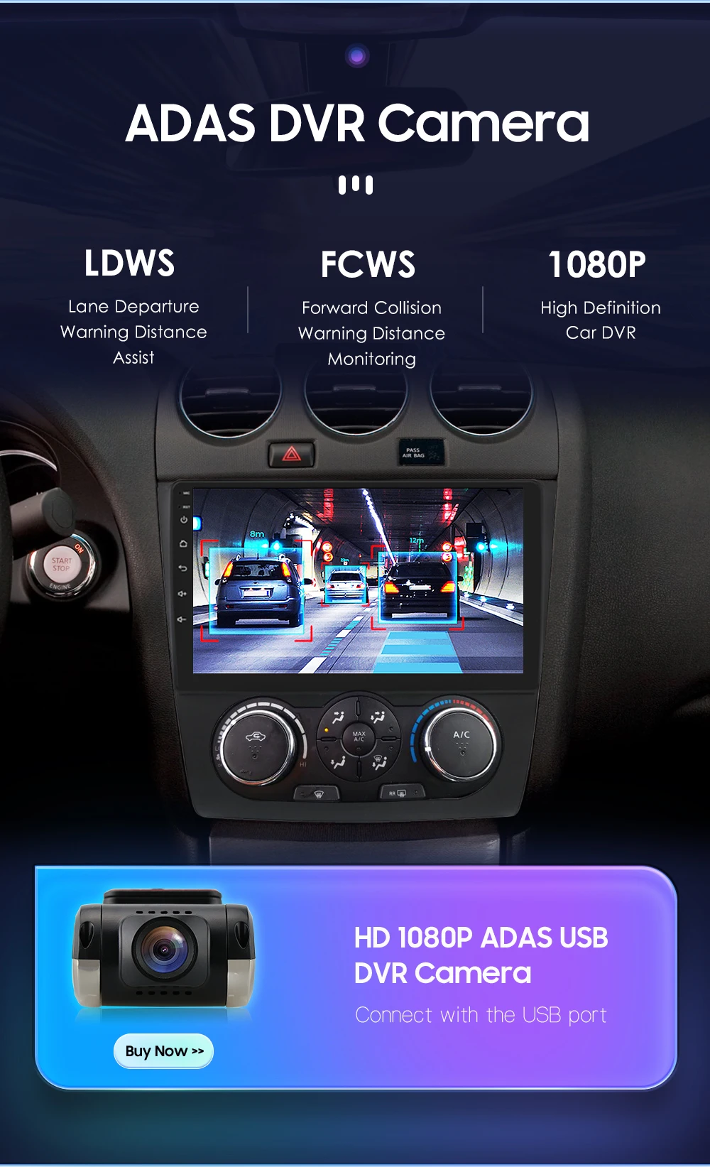 HD 1080P ADAS DVR Camera(Needs to order separately) --connect with the USB port:  LDWS(Lane Departure Warning Distance),FCWS(Forward Collision Warning Distance), 1080P(High Definition Car DVR).