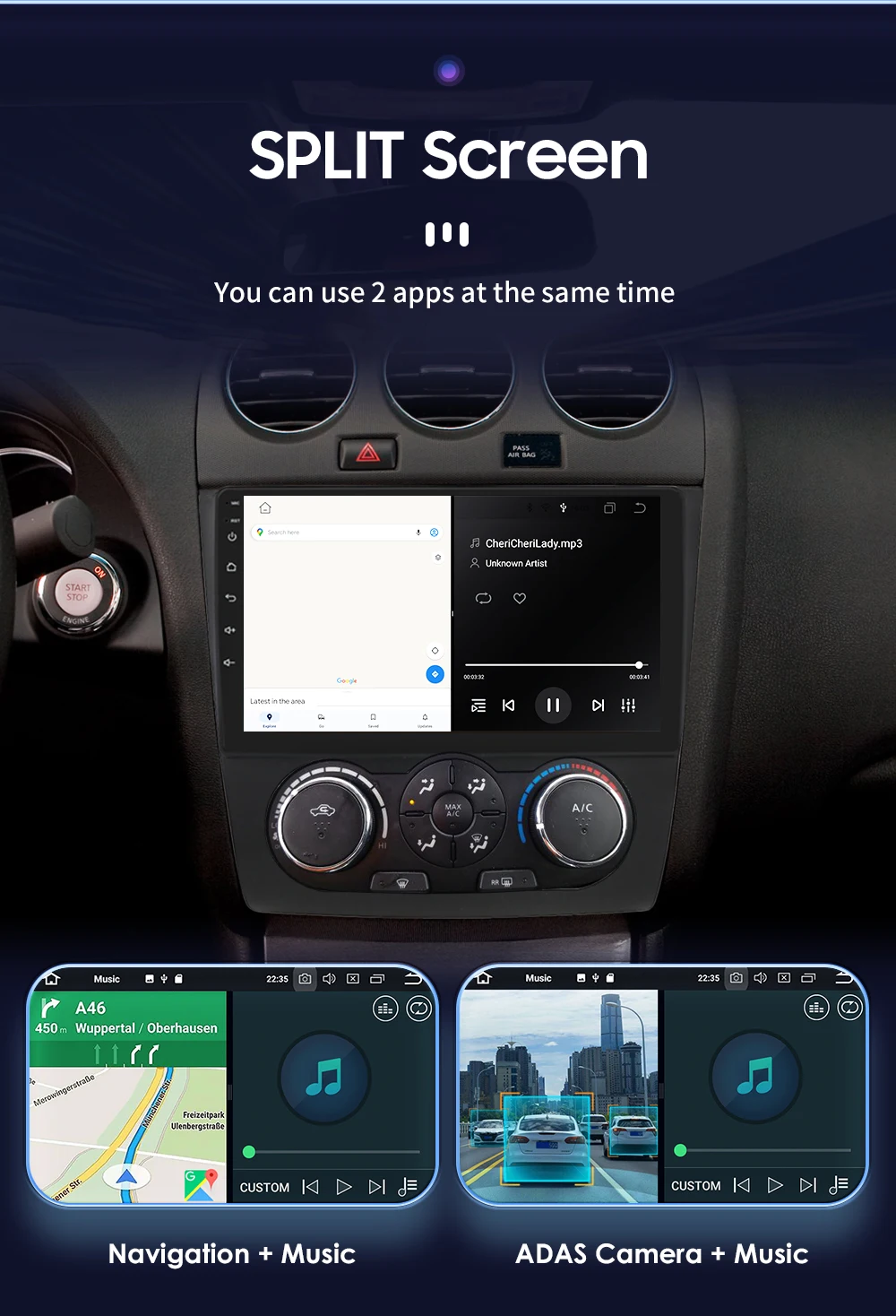 Split Screen : You can use 2 apps at the same time (such as: Navigation + Music , ADAS Camera + Music ,etc.)