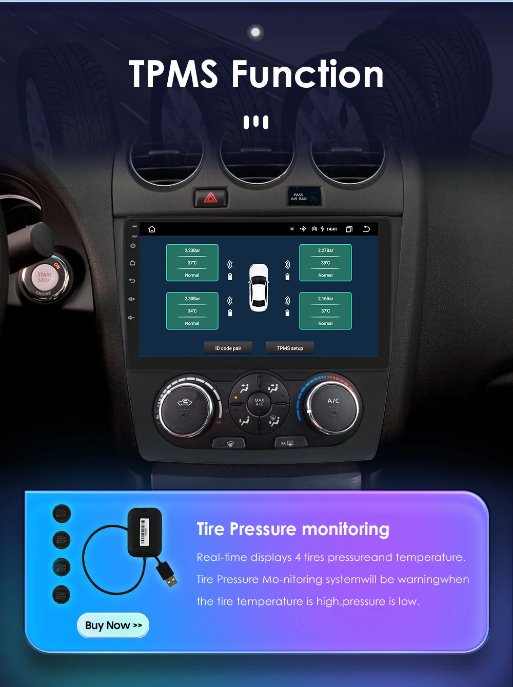 TPMS Function( Needs to order separately) :  Tire Pressure Monitoring: Real-time displays 4 tires pressure and temperature,Tire Pressure Monitoring system will be warning when the tire temperature is high, pressure is low.