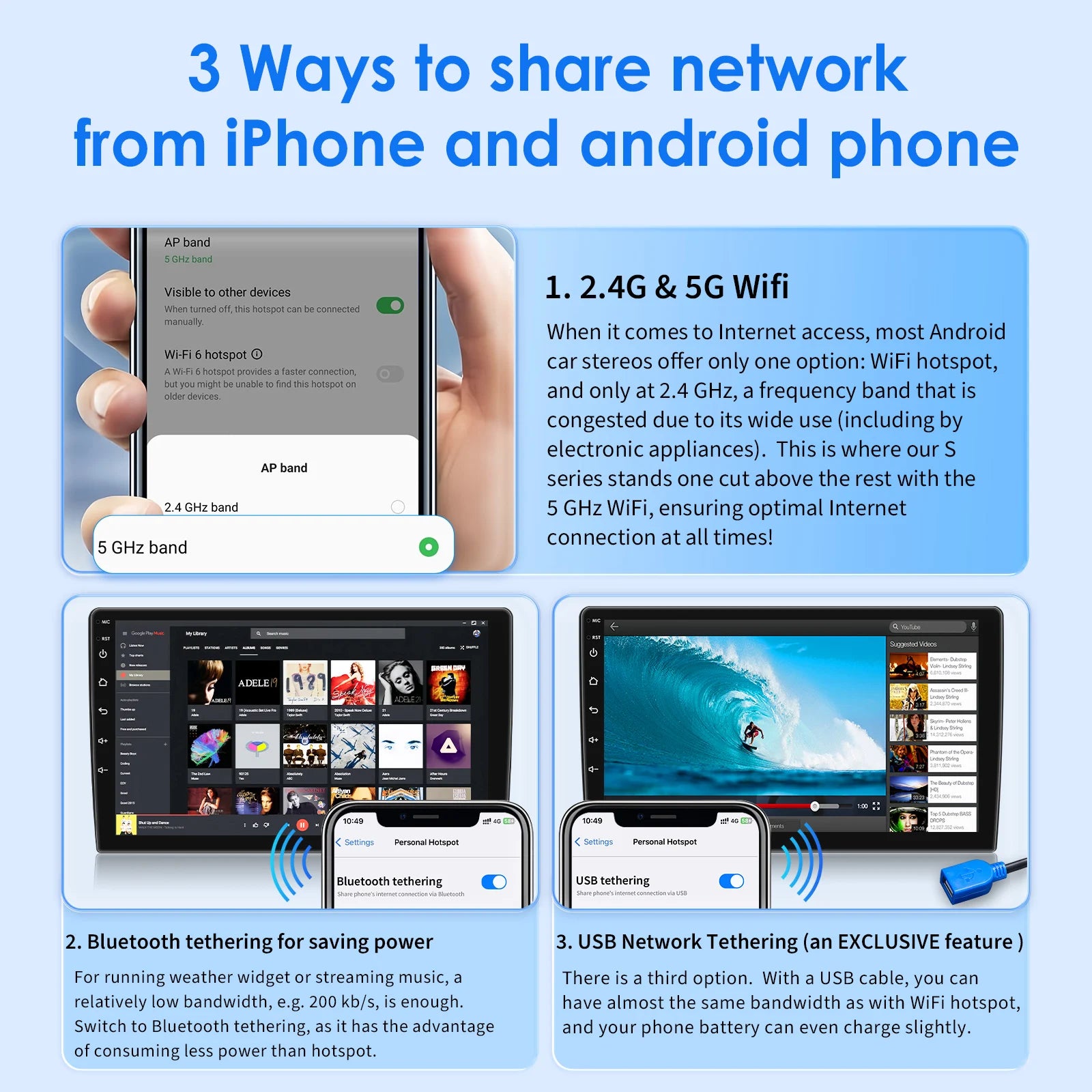 Support Carplay / Android auto: Phone / Music / Maps / Podcasts Make your journey easier and more fun. support wireless carplay,wired android auto,wireless android auto(which needs to set its cell phone wifi hotspot's AP Band as 5 Ghz band).