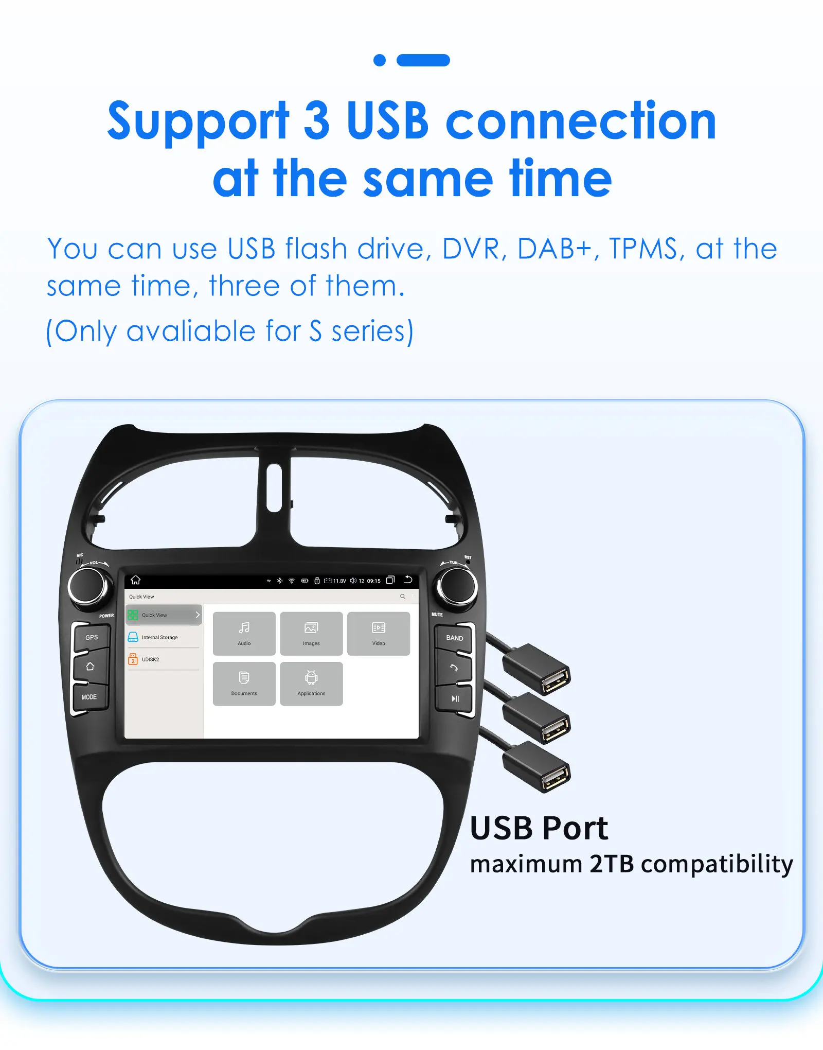 You can use USB flash drive,DVR,DAB+,TPMS at the same time,three of them (Only avaliable for S series)