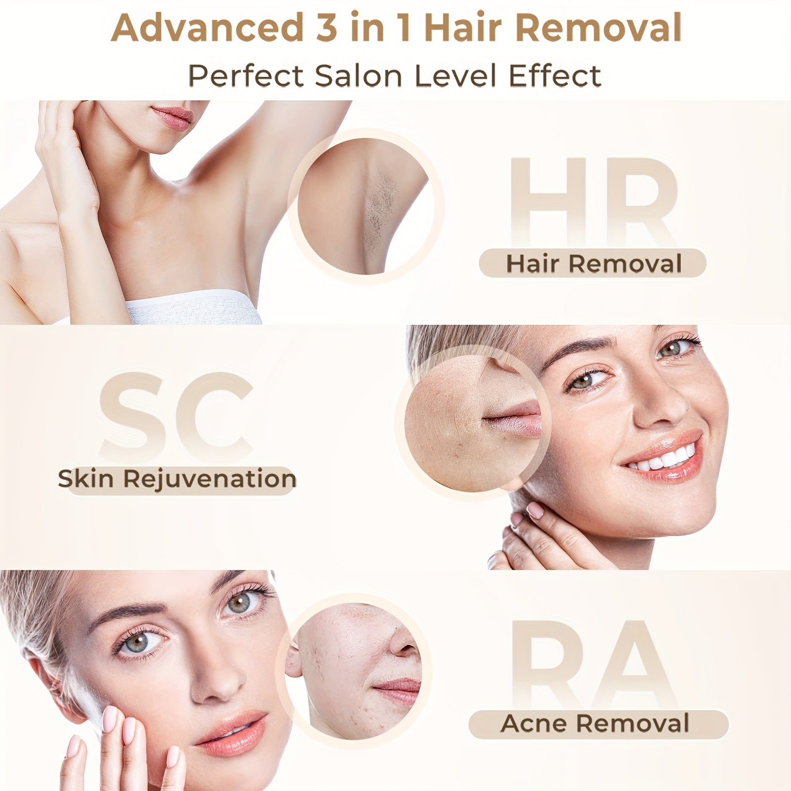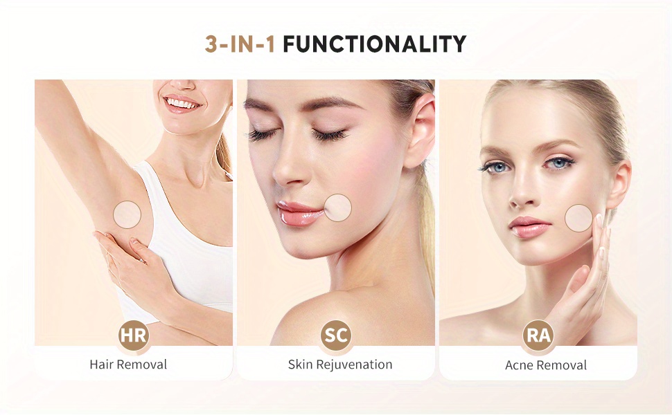 【Upgraded Version with 3 Functions】Upgraded 3 functions: HR, RA and SC .The upgraded laser hair removal device not only has the usual hair removal function, but also allows you to achieve a skin care effect while removing hair.
