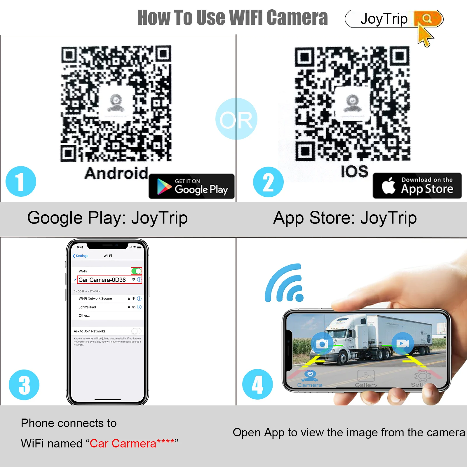 View camera pictures on your smartphones. Our WiFi magnetic battery powered rear view camera offers you the flexibility and freedom of quickly mounting a backup camera on your vehicle and watching the video stream with your smartphone. You can scan the QR code on our manual to easily download this free APP, which supports both iOS and Android devices.