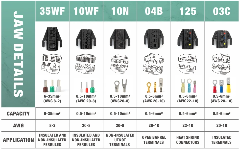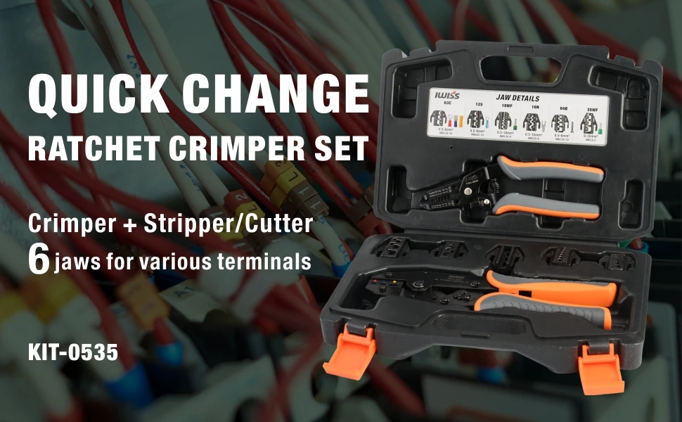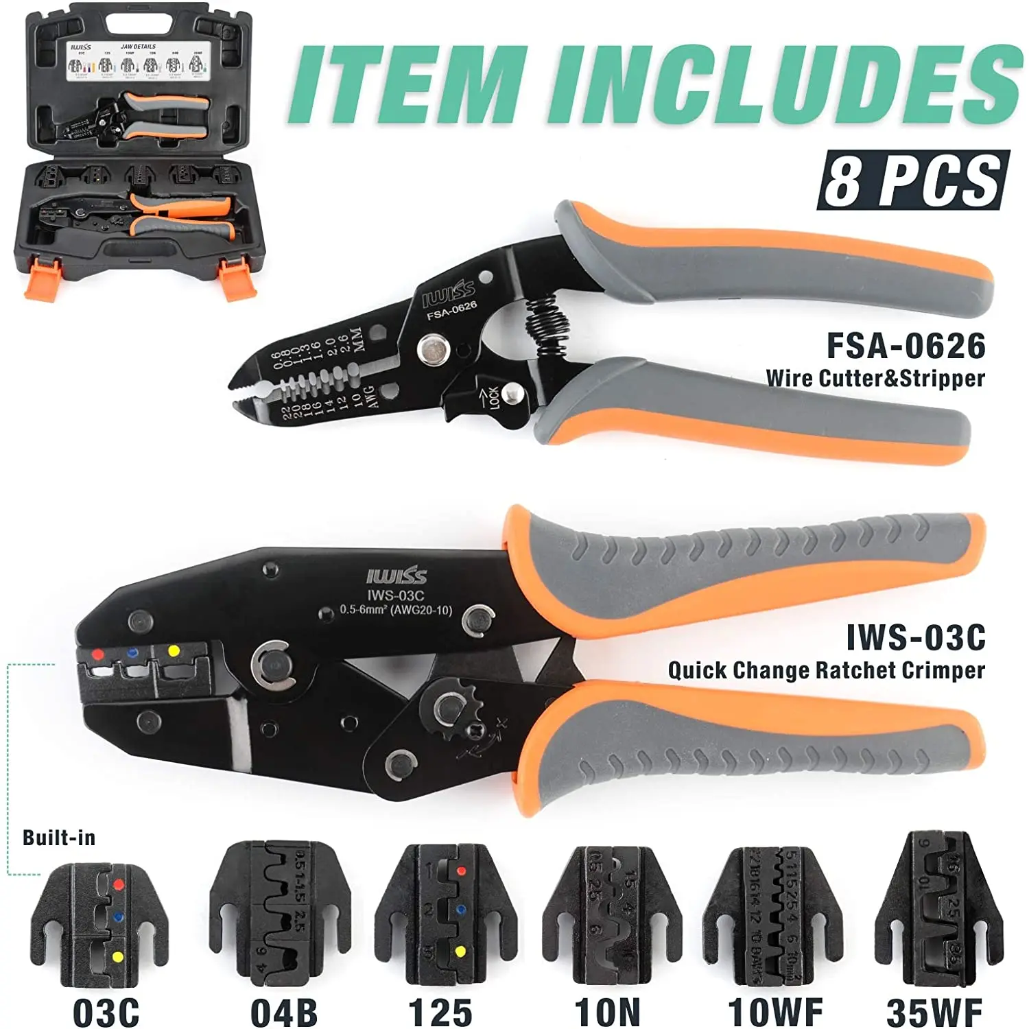 IWISS Ratcheting Crimping Tool Set 8 PCS - Quick Exchange Jaw for Heat Shrink, Non-Insulated, Open Barrel, Insulated and Non-Insulated Ferrules AWG 20-2