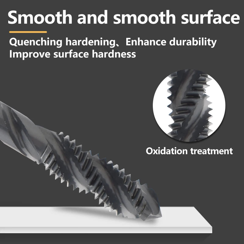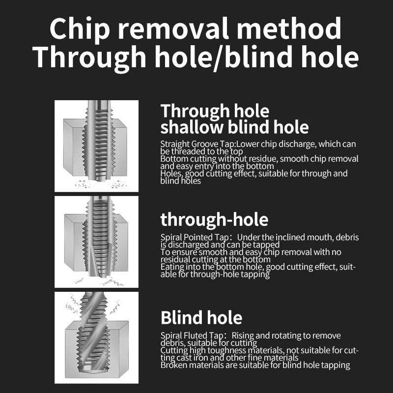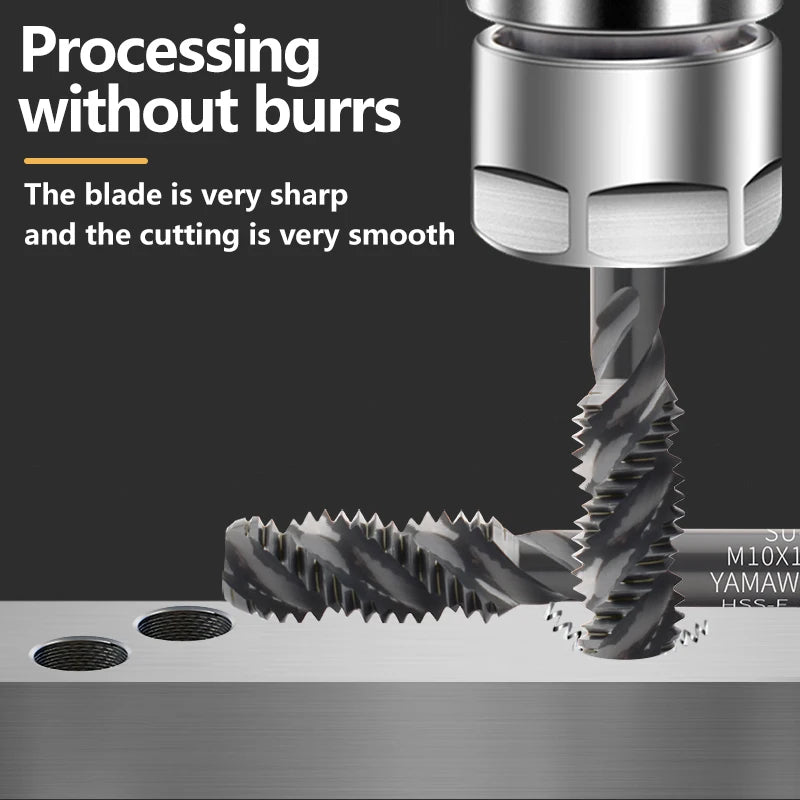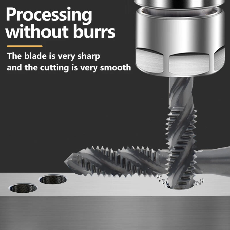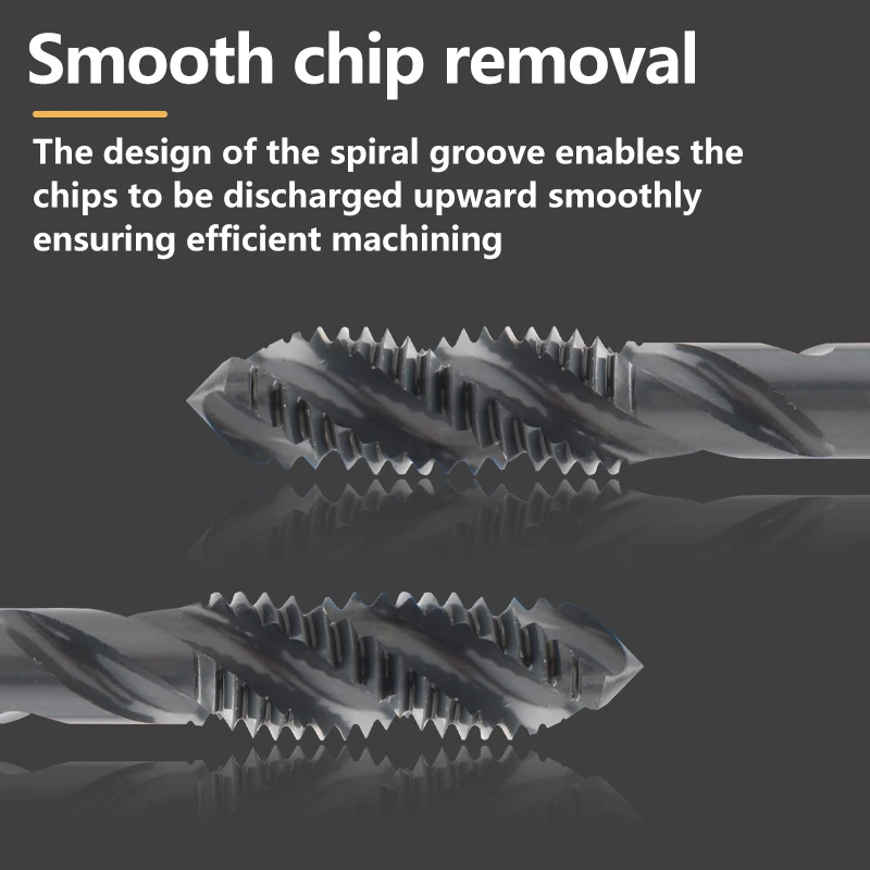 Spiral Tap the crumbs into a spiral up chip evacuation, it is more suitable for the processing of blind holes and sticky materials processing.