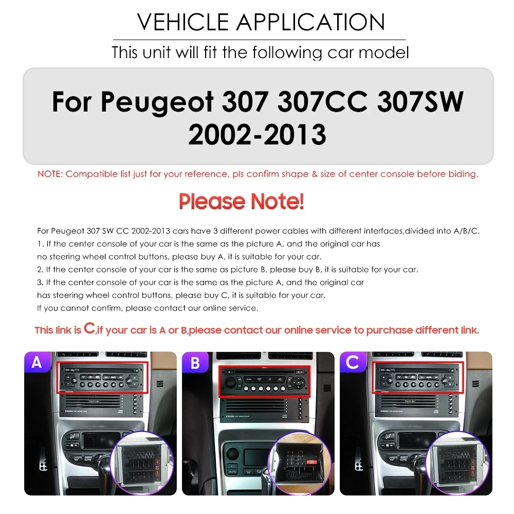 For Peugeot 307 SW CC 2002-2013 cars have 3 different power cables with different interfaces, divided into A/B/C. If you buy the wrong choice, the car radio will be unusable.