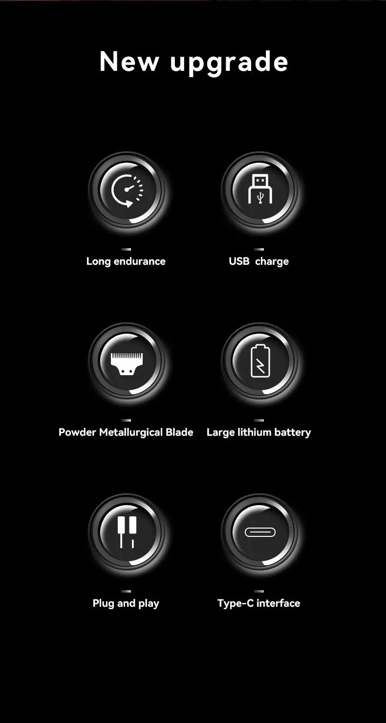 • Accessories: 6 x guide combs, 1 x cleaning brush, 1 x charge stand, 1 x comb, 1 x type-c USB cable