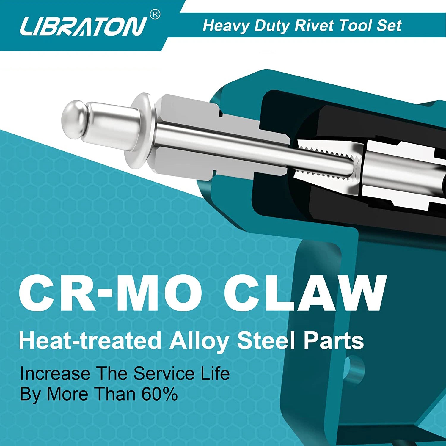 High Quality: Libraton heavy-duty rivet gun set includes an aluminum rivet gun, a mini wrench, 25 each of 4 sizes of rivets, and 1 each of 4 sizes of HSS drills. The set provides full-process support for riveting work.