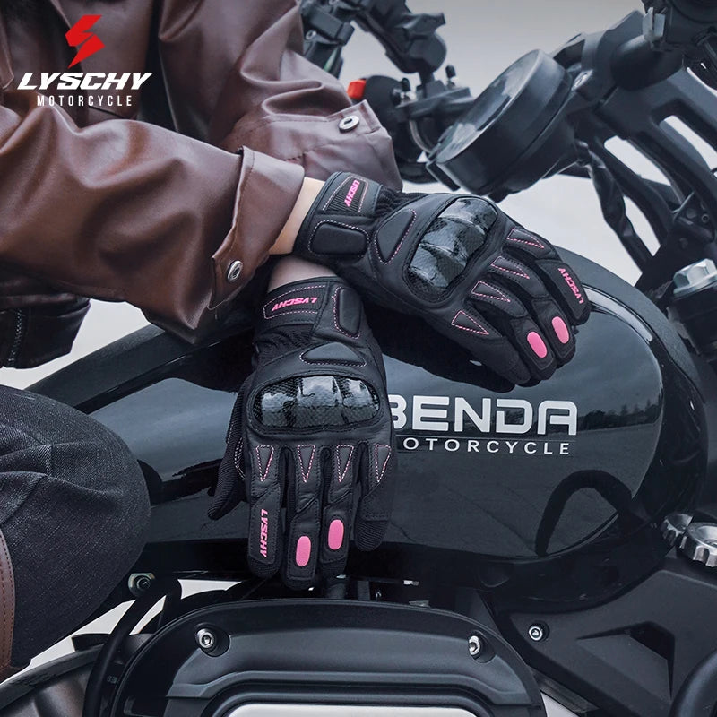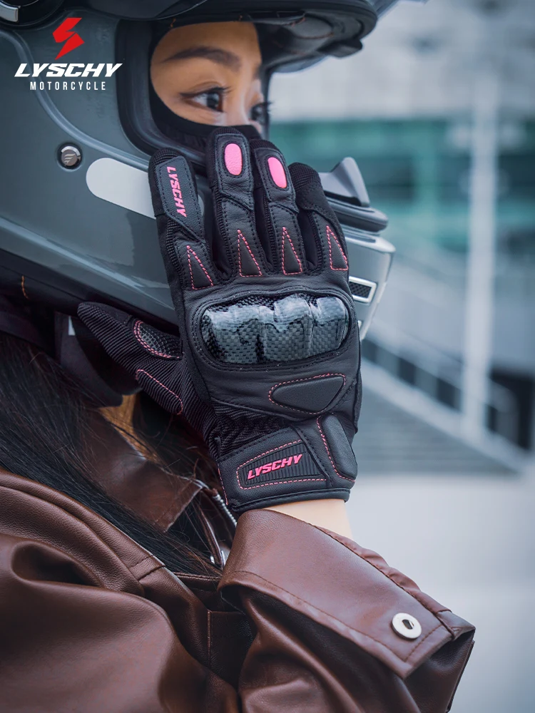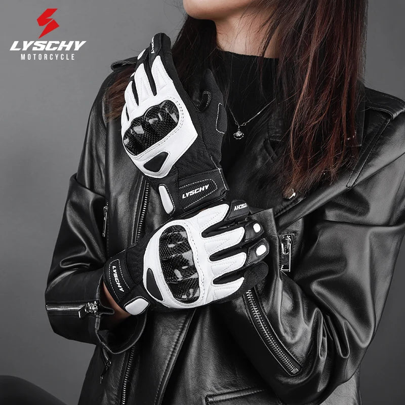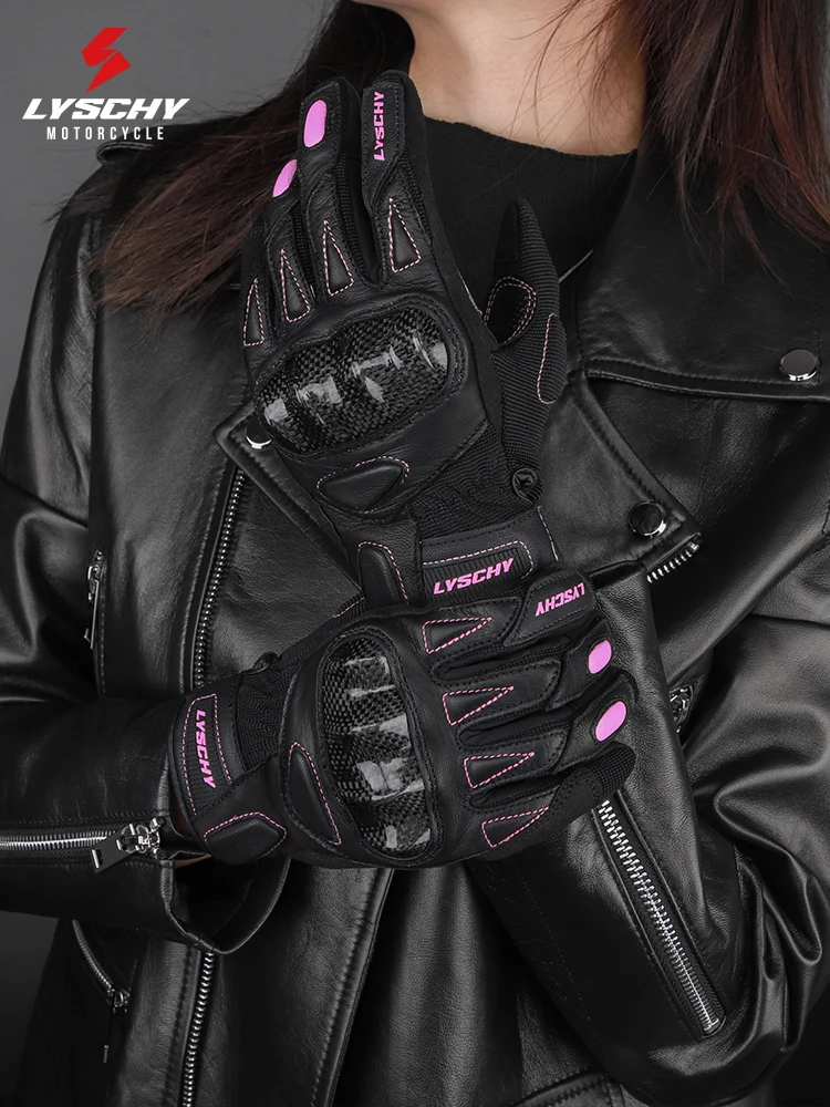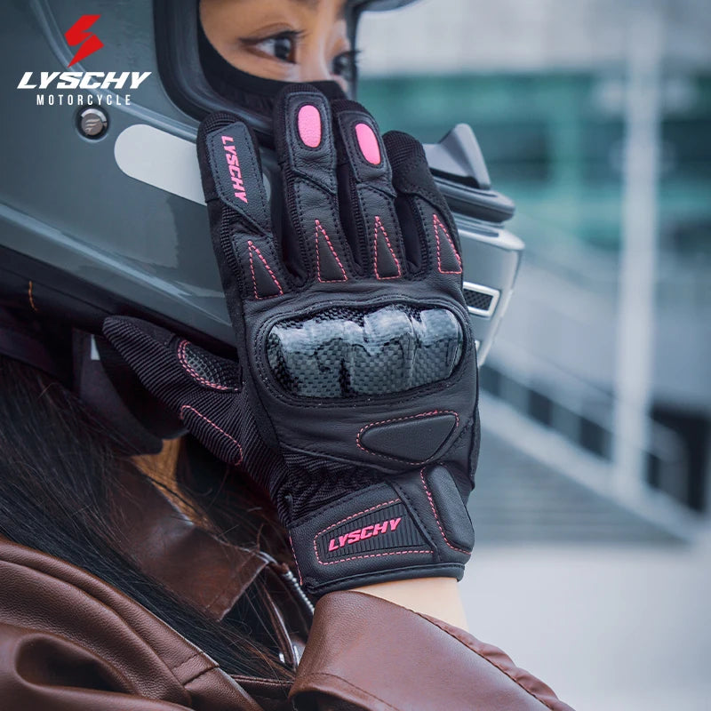 LYSCHY Summer Girls Motorcycle Leather Gloves Soft Goat Leather Carbon Fiber Shell Protector Riding Gloves Touch Screen Gloves LY-GW019