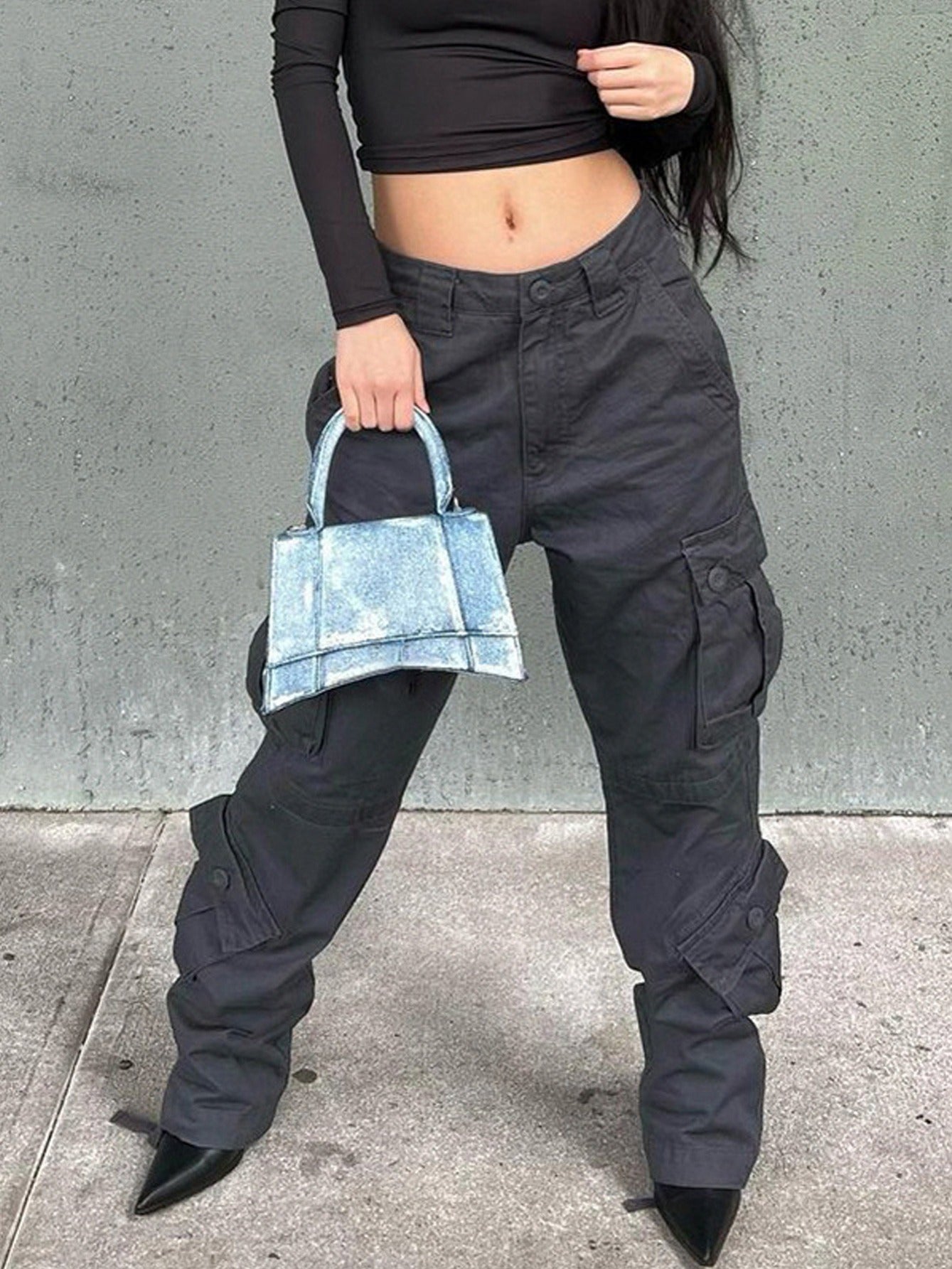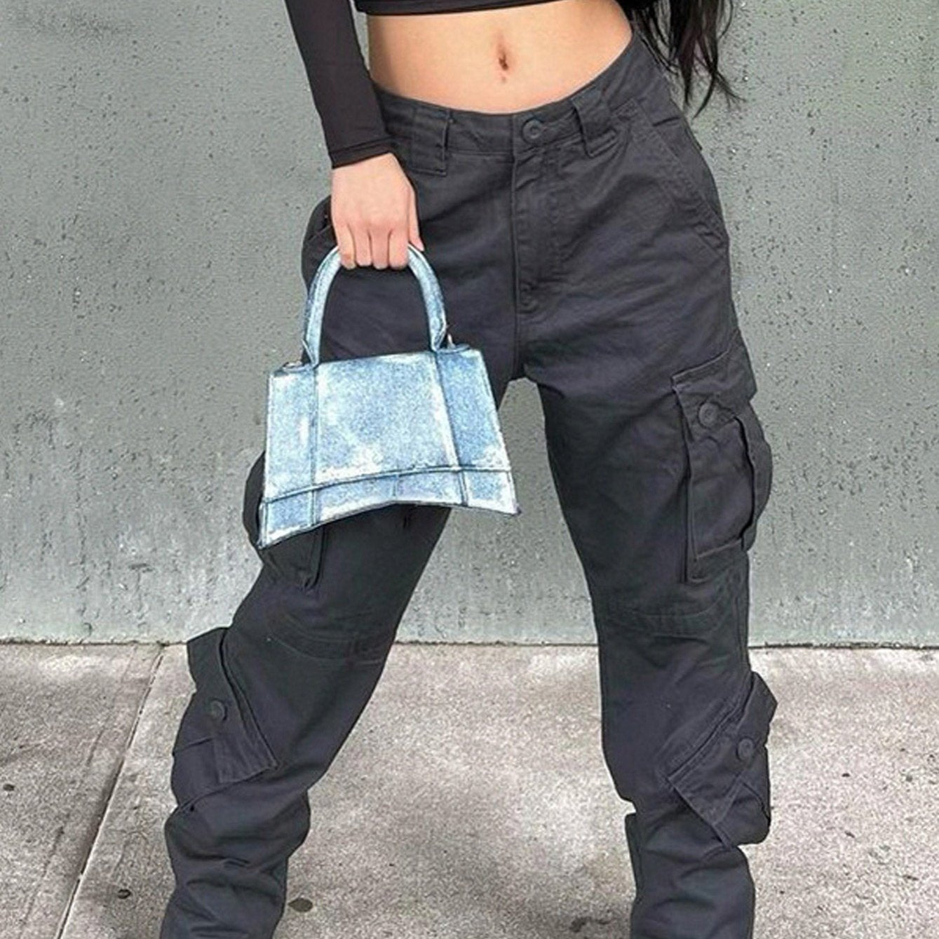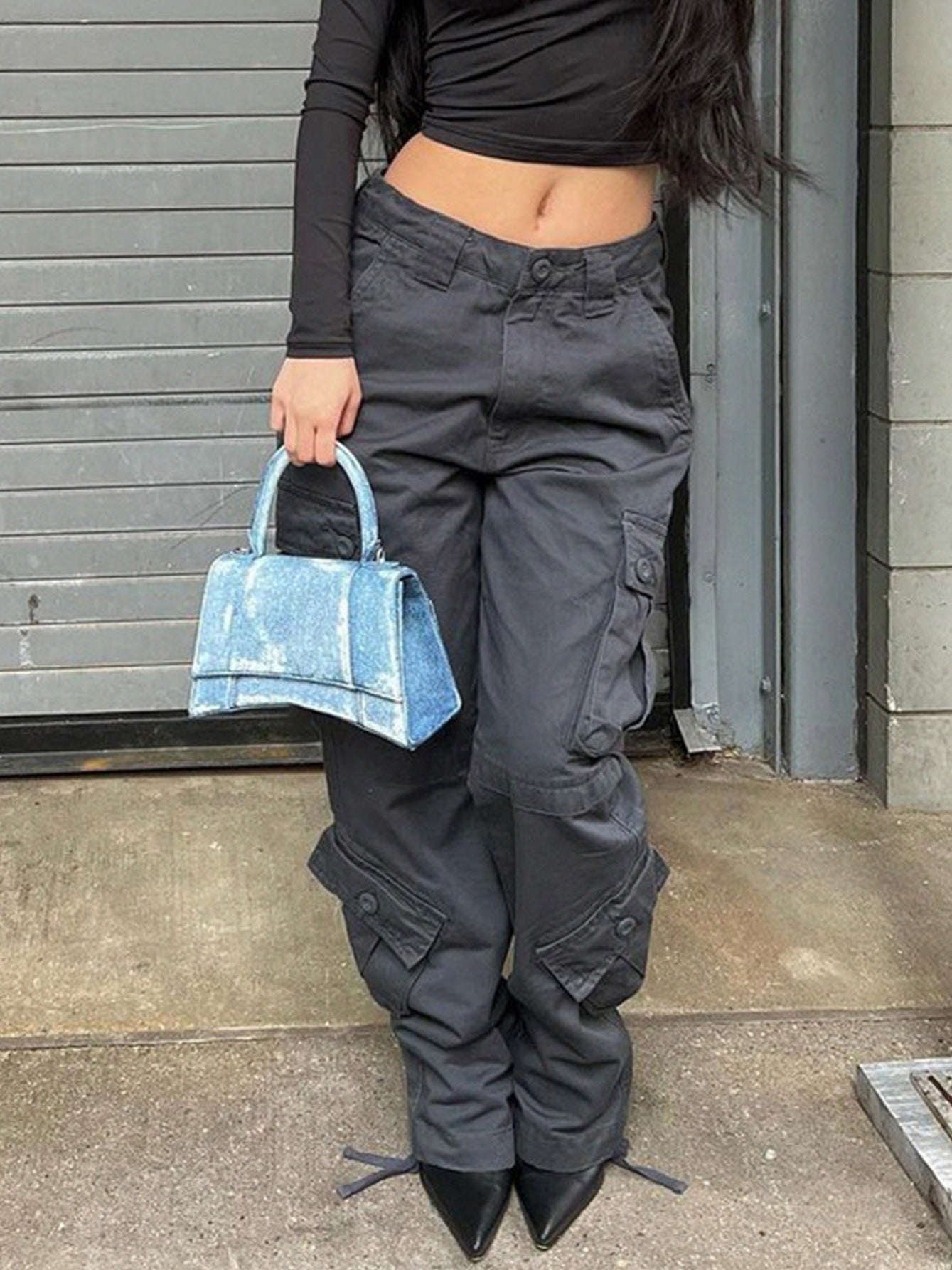 Mid-Rise Dark Gray Cargo Pants, Relaxed Fit Loose Straight Leg Cargo Style Jeans With Pockets,Y2K Kpop Vintage Style, Women's Clothing & Denim