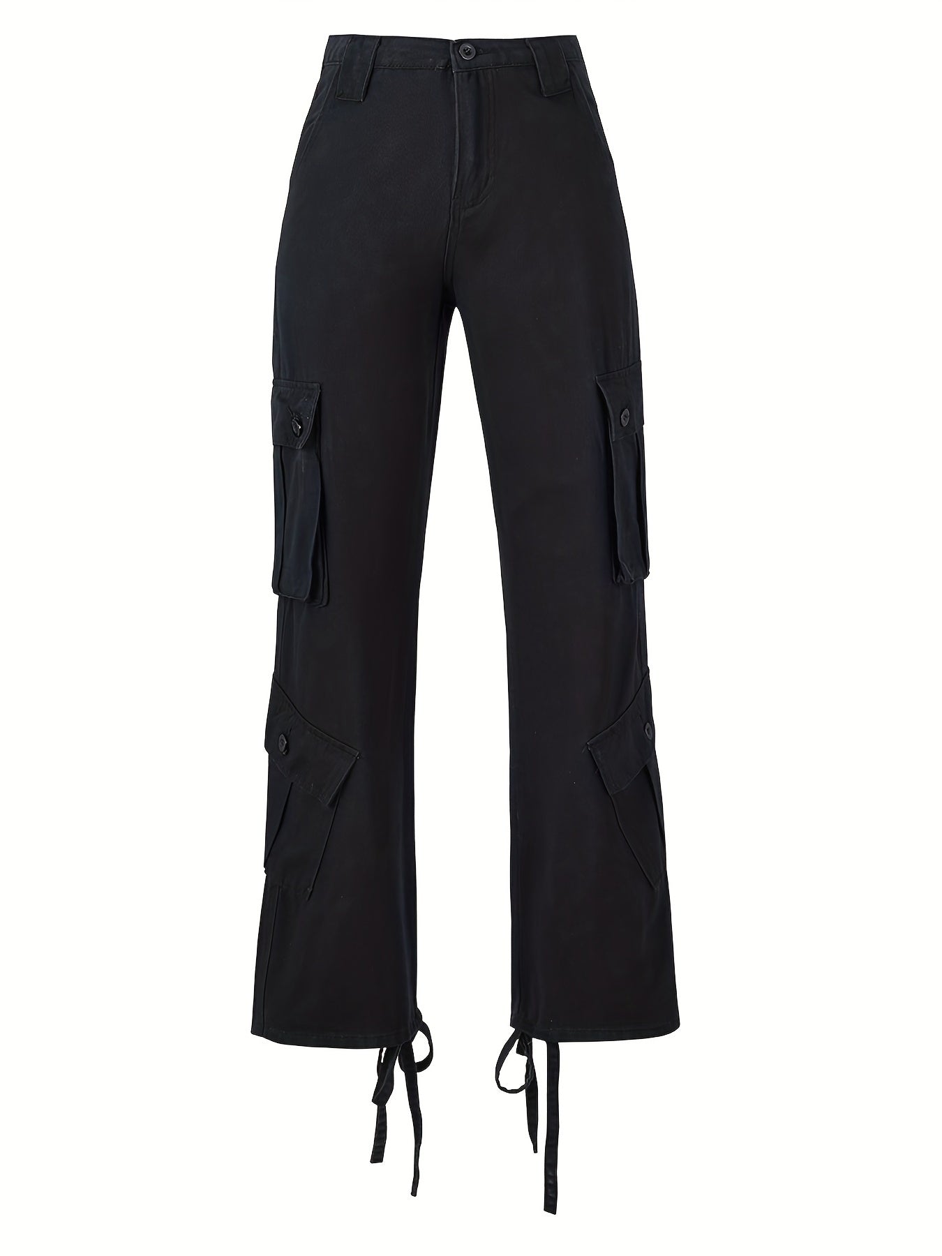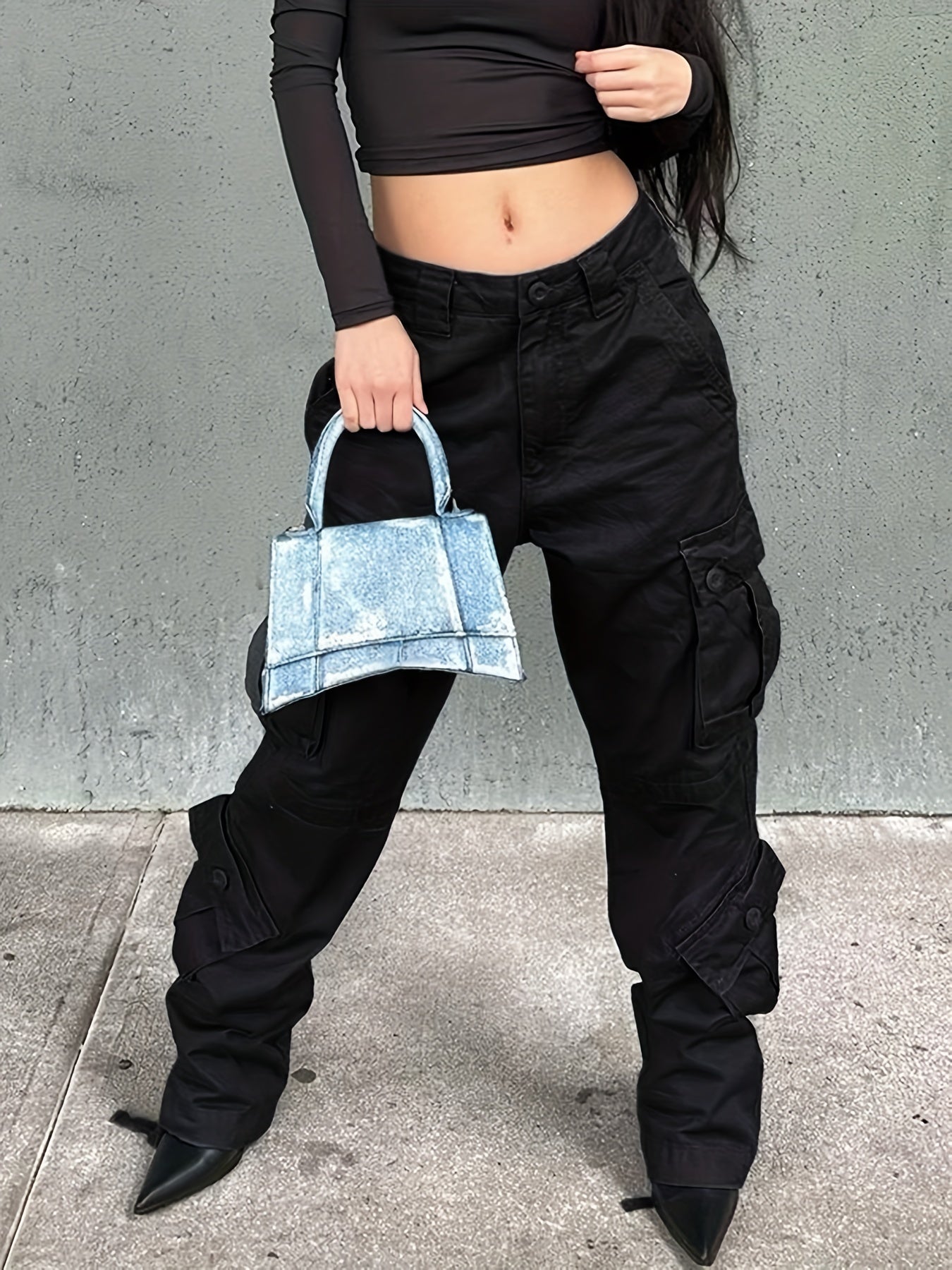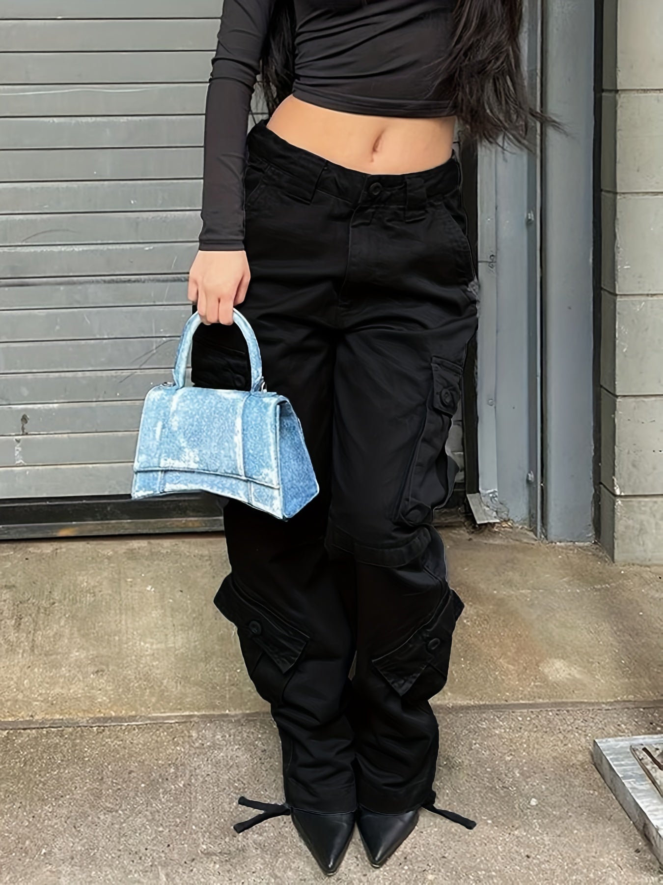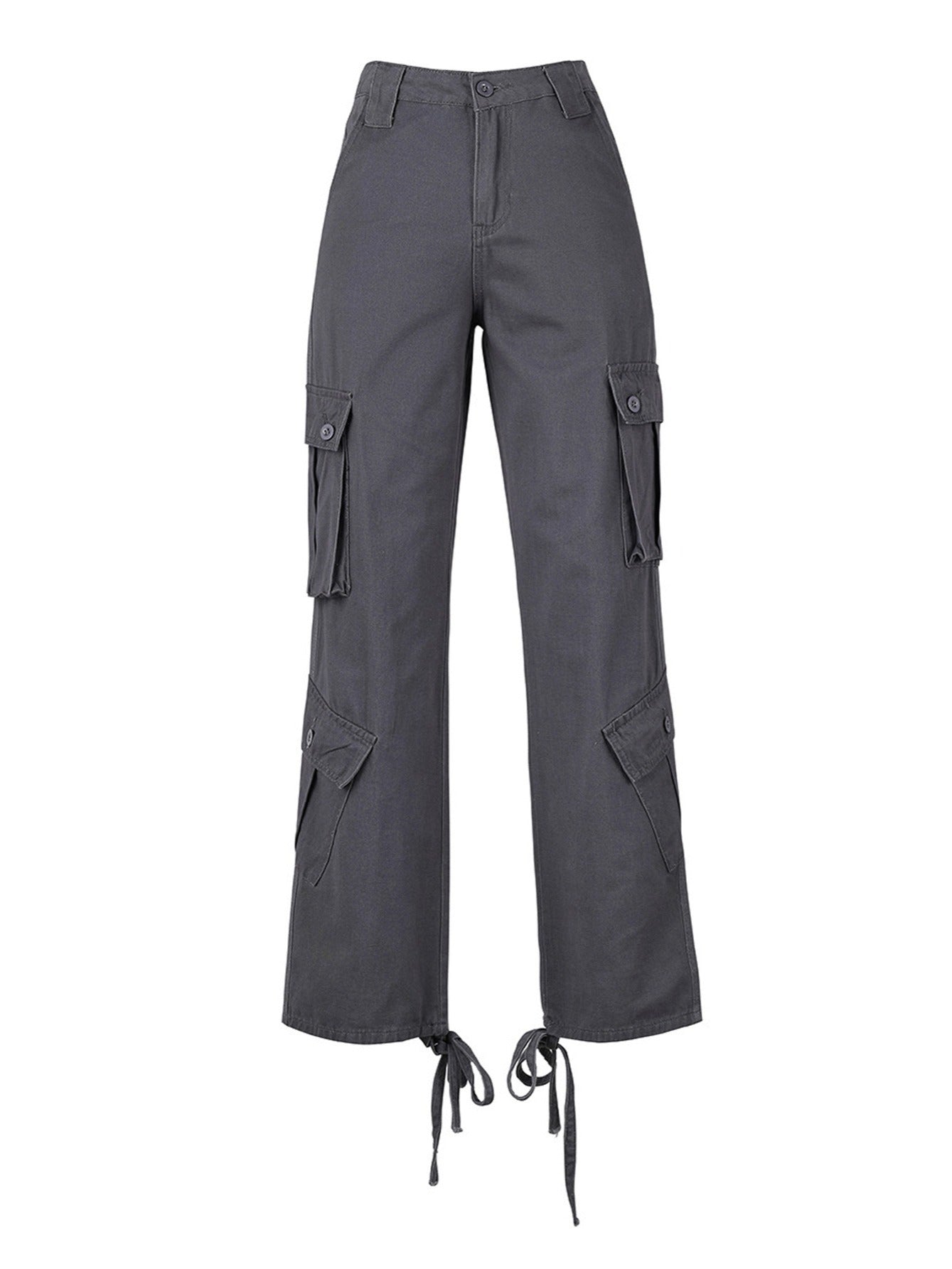 Mid-Rise Dark Gray Cargo Pants, Relaxed Fit Loose Straight Leg Cargo Style Jeans With Pockets,Y2K Kpop Vintage Style, Women's Clothing & Denim