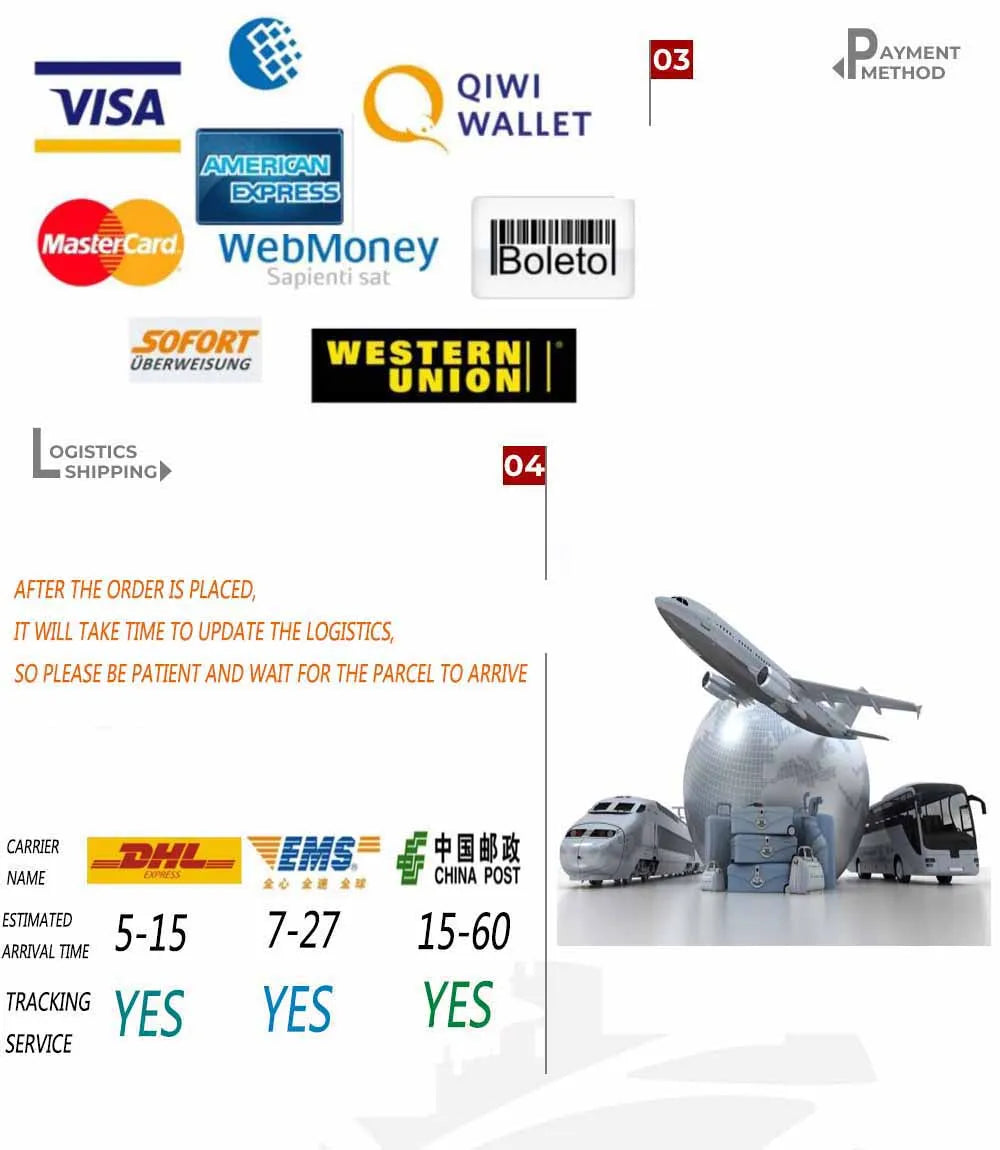 Answer: After the payment is completed, we need 1-3 days to process the order before sending it to the courier company. The courier company needs to check and record, and then arrange delivery. Under normal circumstances, it takes 3-5 days to update the first tracking information. If there is no information within 7-10 days, please contact the buyer's service provider.