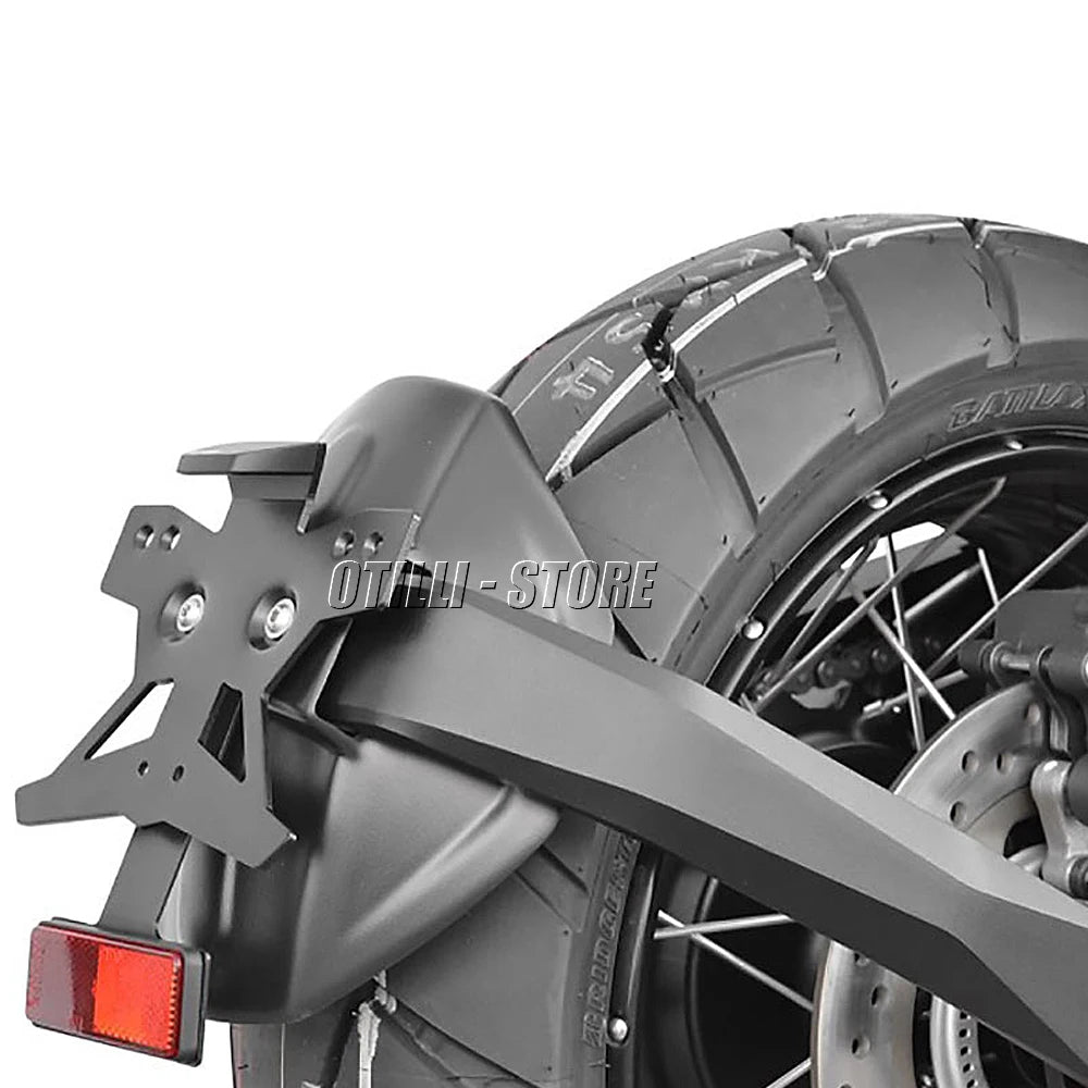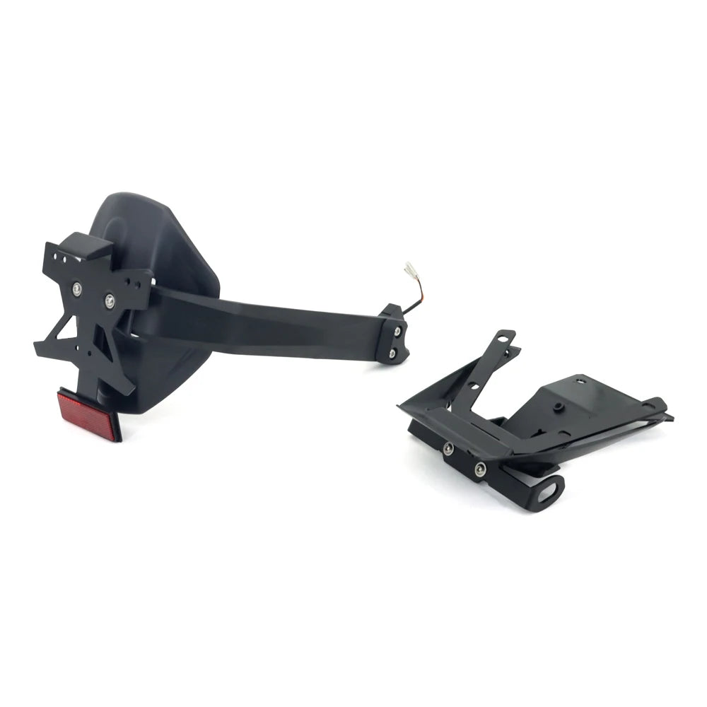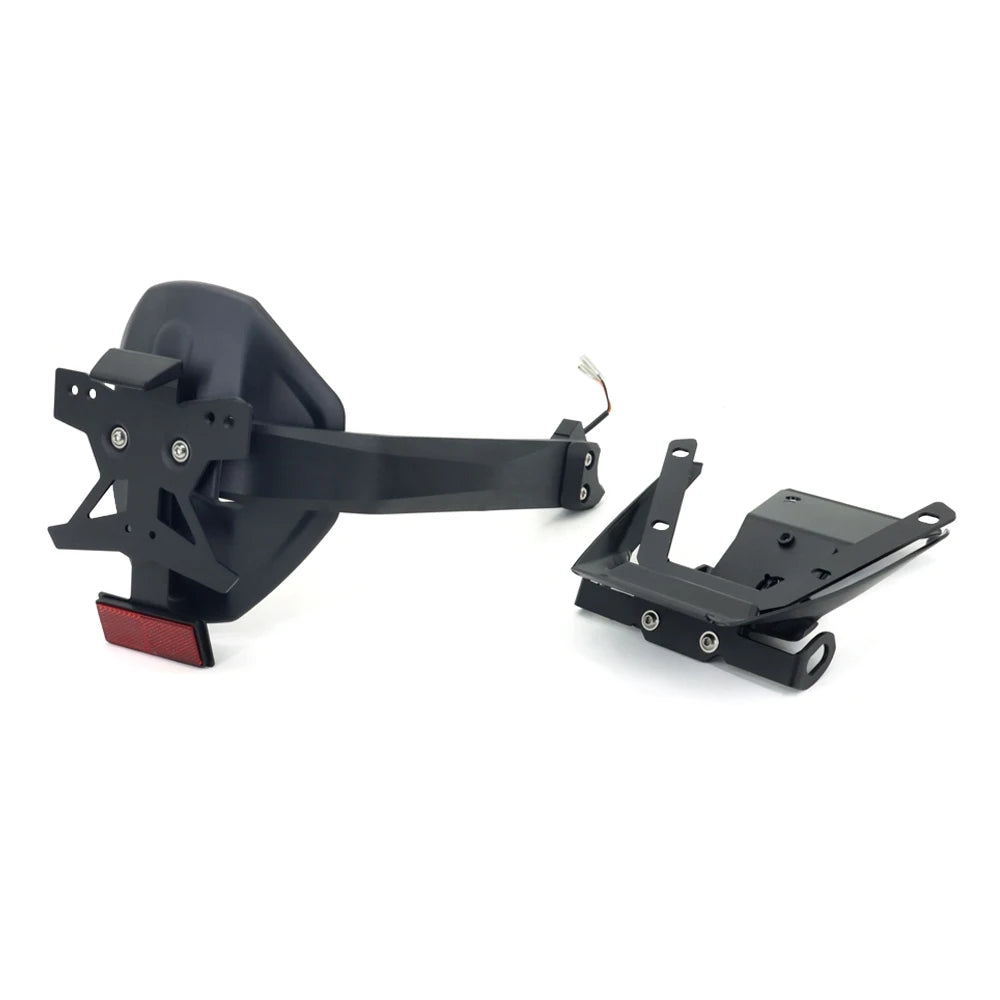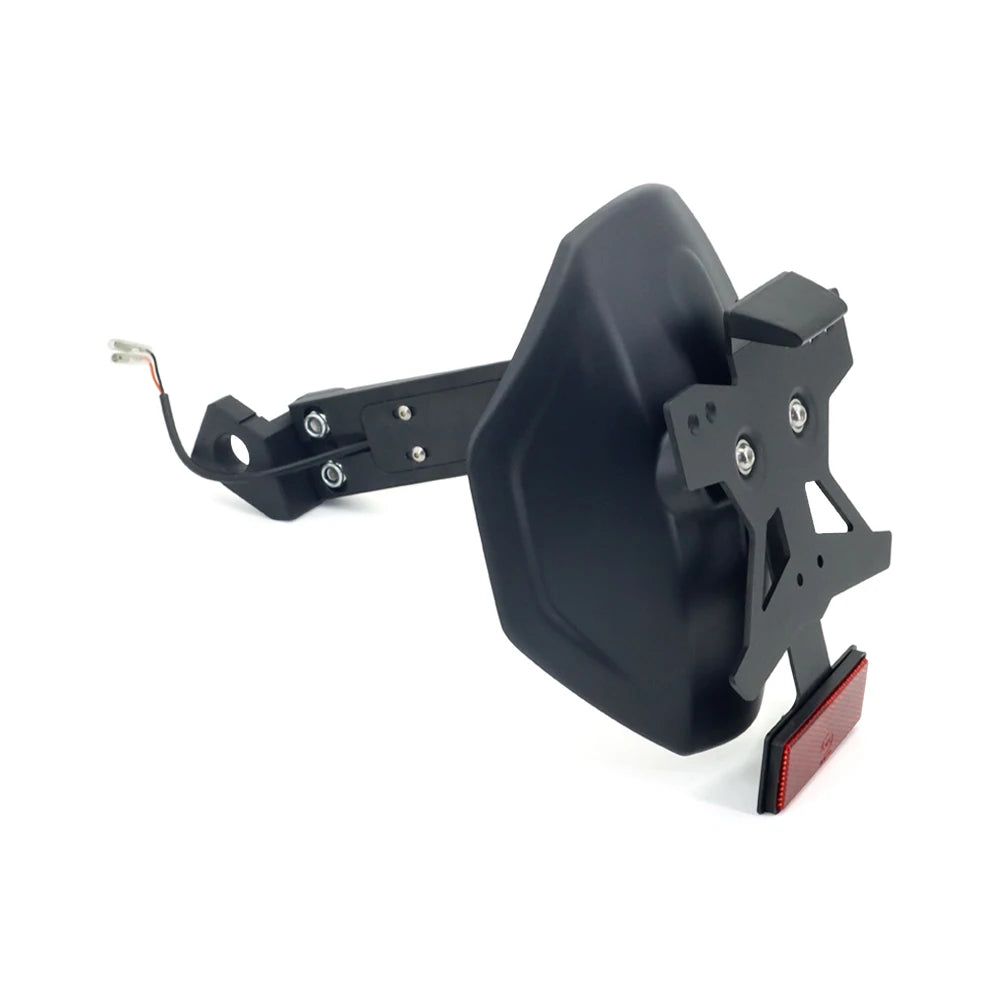 · The turn signals remain in the upper position while the license plate takes place at the level of the tire. The bracket is held by a machined aluminum part that will replace the chain tension spacer. Its implementation is carried out instead, without modification.