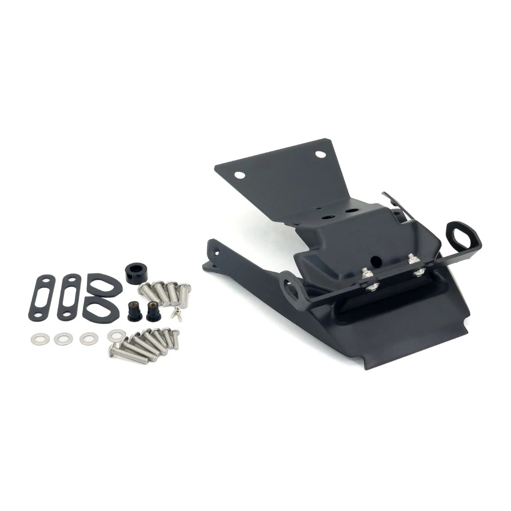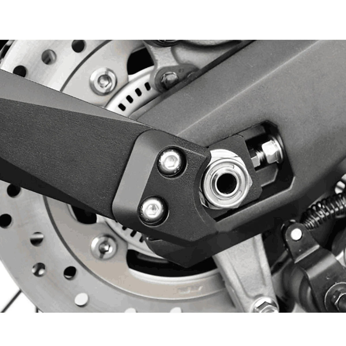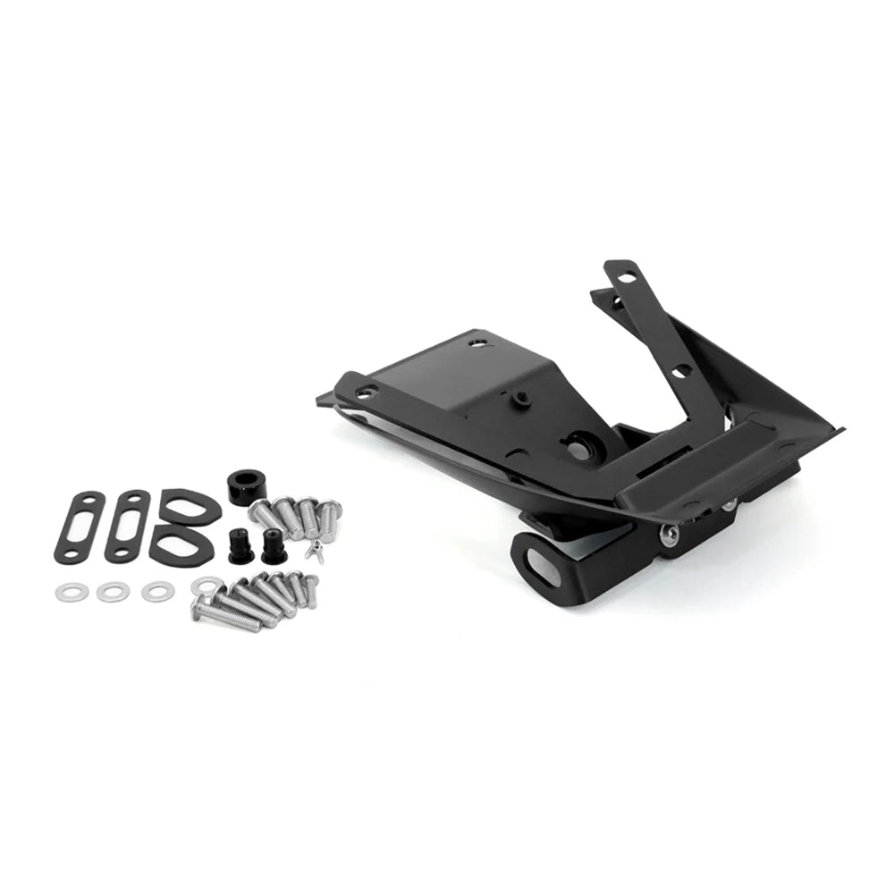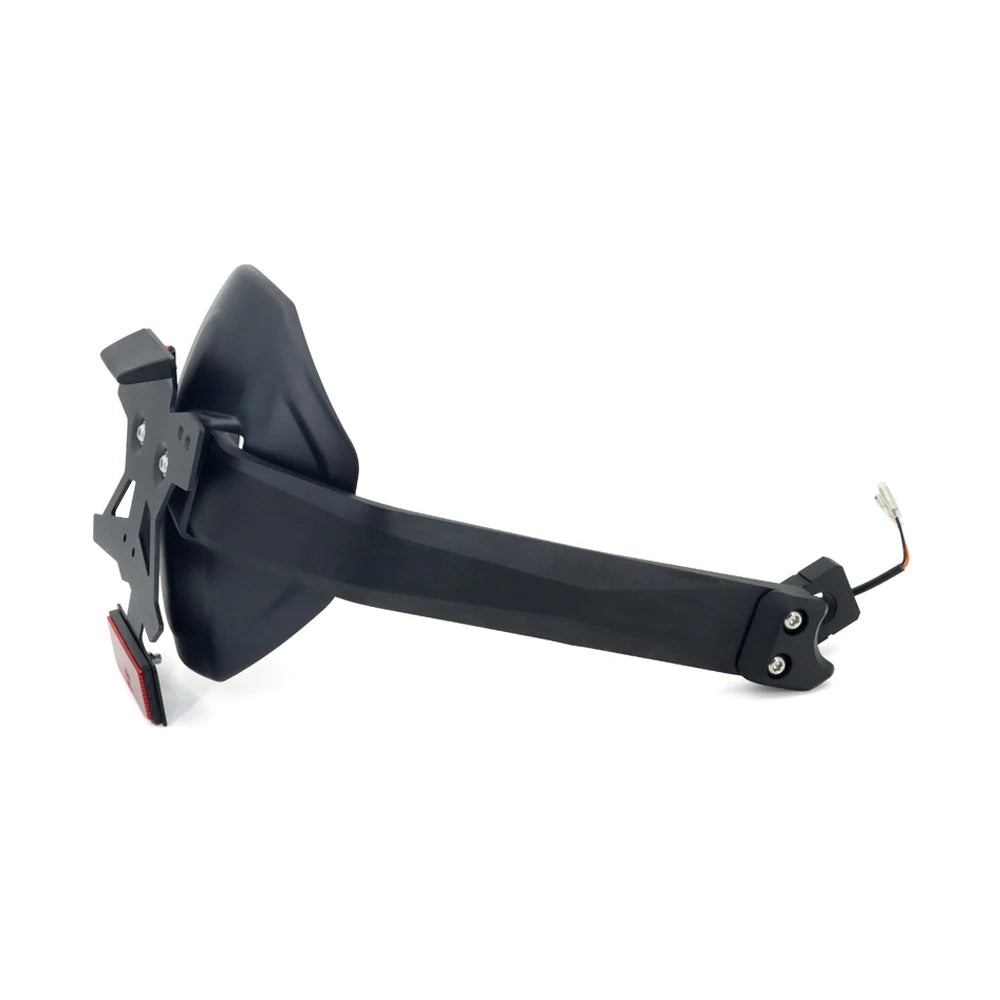 · The turn signals remain in the upper position while the license plate takes place at the level of the tire. The bracket is held by a machined aluminum part that will replace the chain tension spacer. Its implementation is carried out instead, without modification.