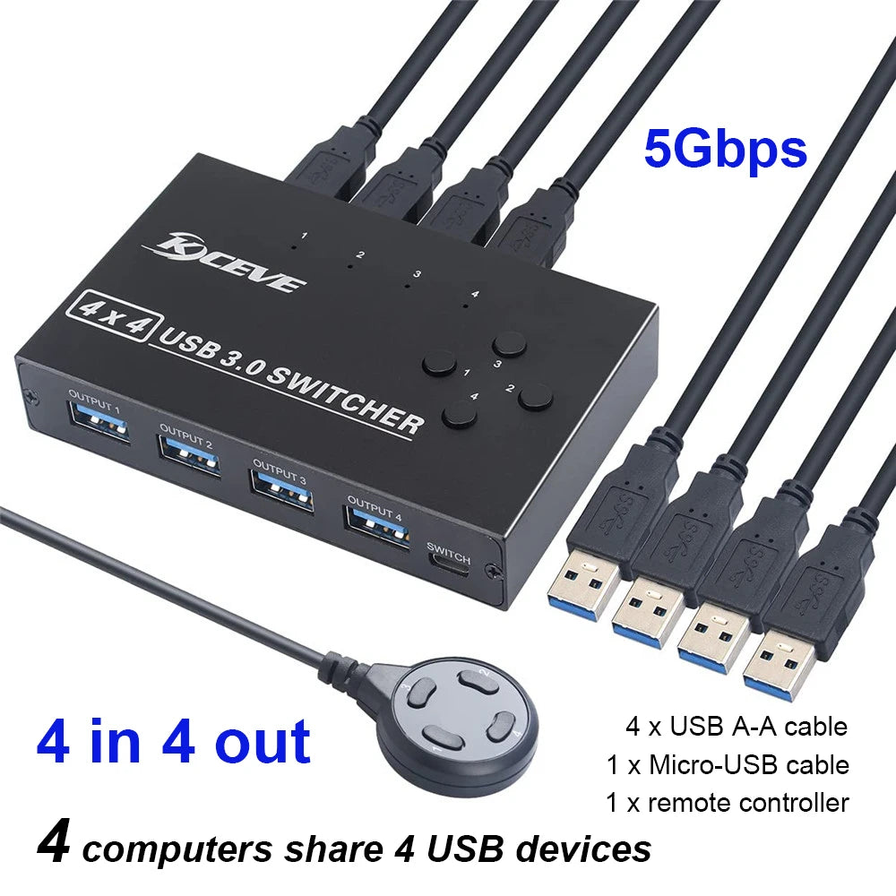 This 4 in 4 out USB 3.0 Switcher allows one button toggle between 4 computers to share 4 USB 3.0 peripheral devices without constantly pull cables or set up complicated network sharing software. Support for wireless mouse and mechanical keyboards.