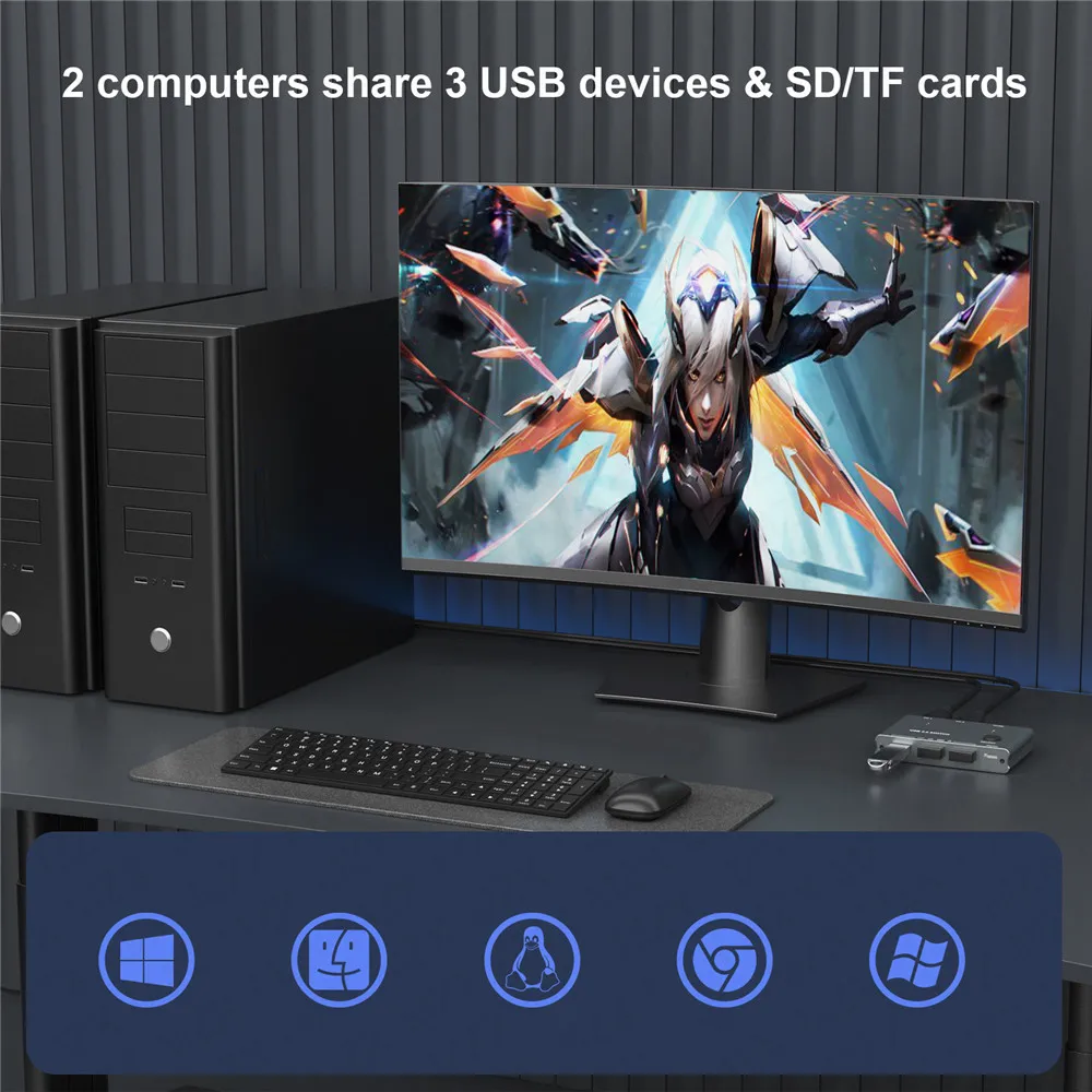 Supports 2 USB inputs and 3 USB HUB outputs, and SD / TF card readers. 3 port USB switch works flawlessly with Windows 10/8/8.1/7/Vista/XP, Mac OS X, Linux, and Chrome OS. Driver-free, simply plug and play.