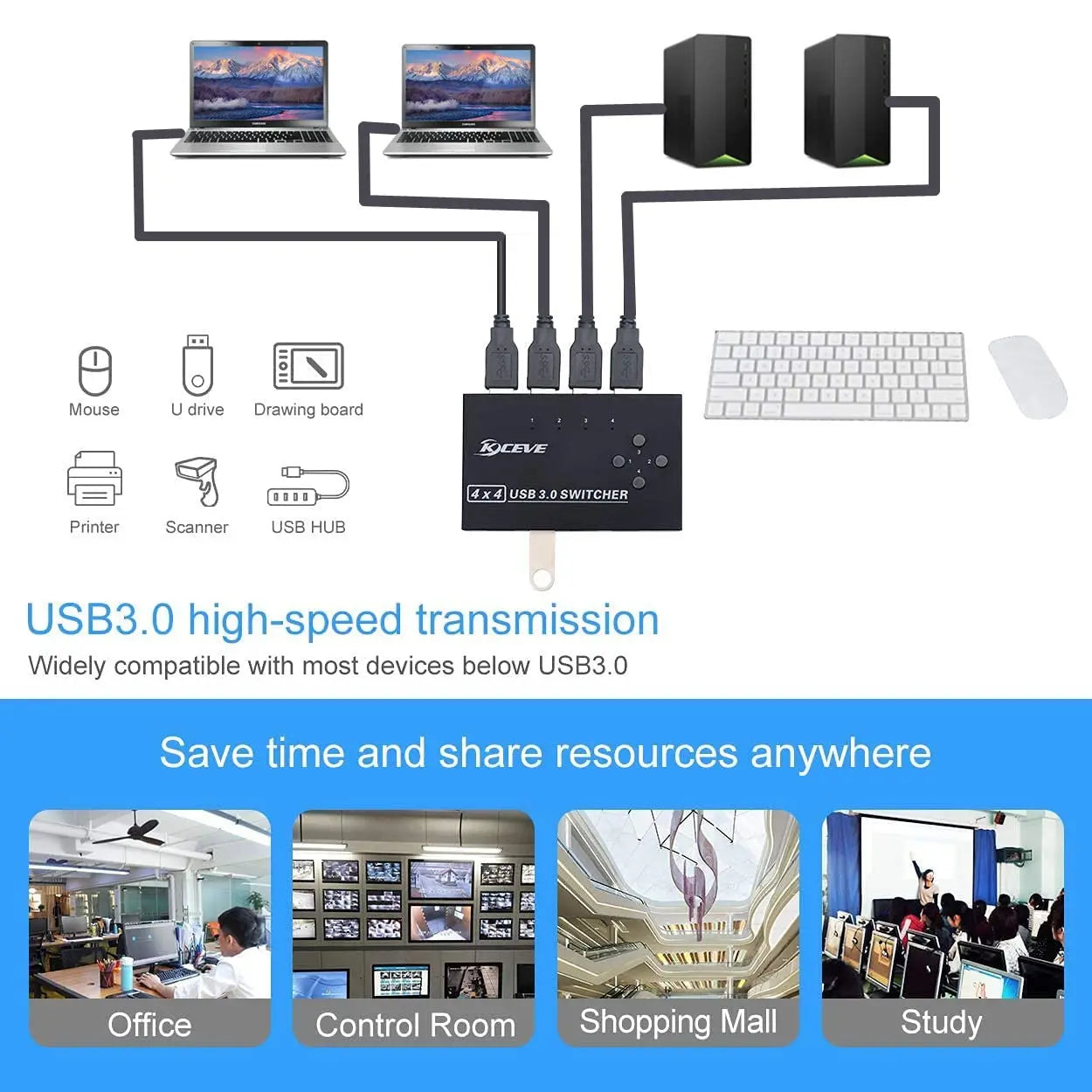 Supports 4 USB inputs and 4 USB HUB outputs. 4 port USB 3.0 switch works flawlessly with Windows 10/8/8.1/7/Vista/XP, Mac OS X, Linux, and Chrome OS. Driver-free, simply plug and play.