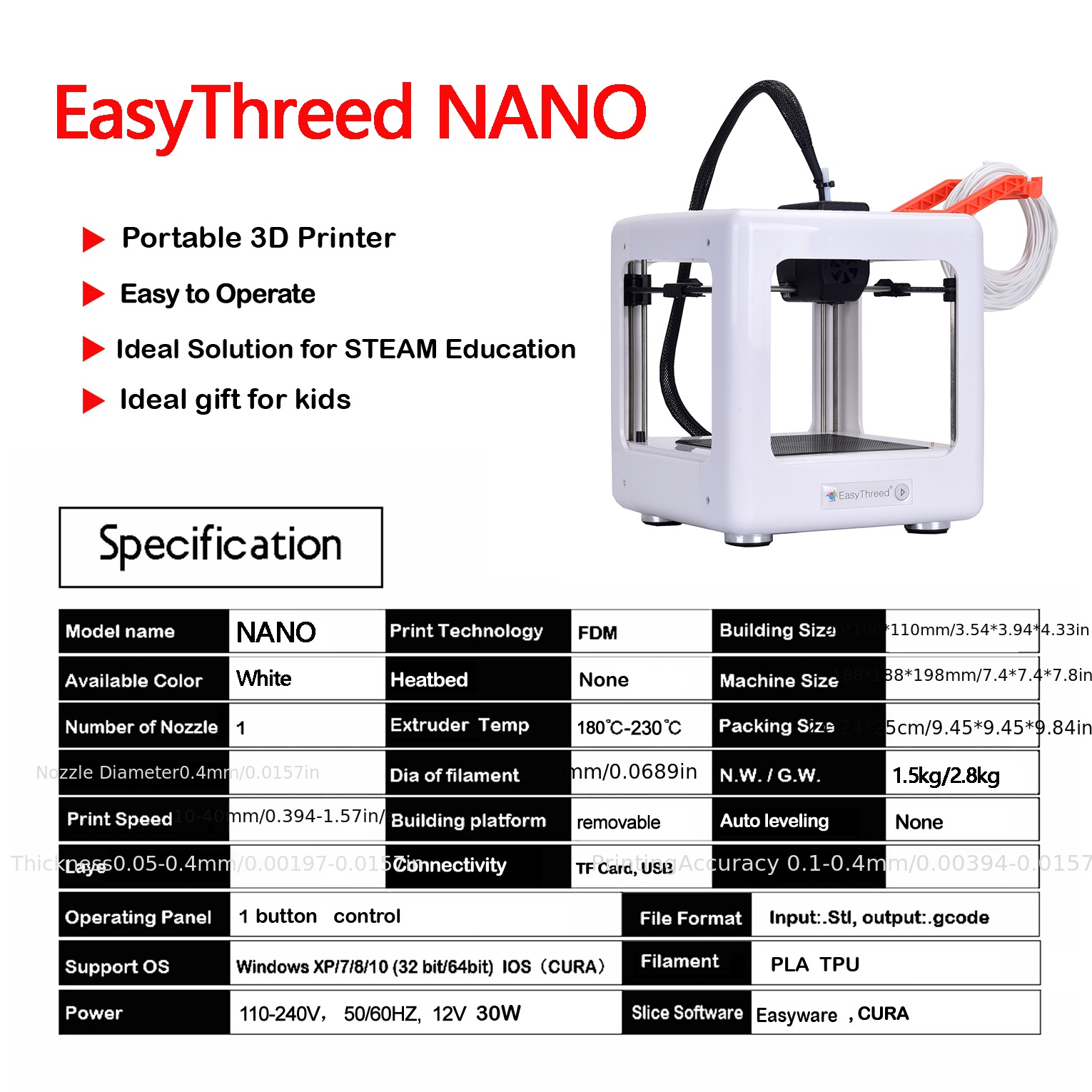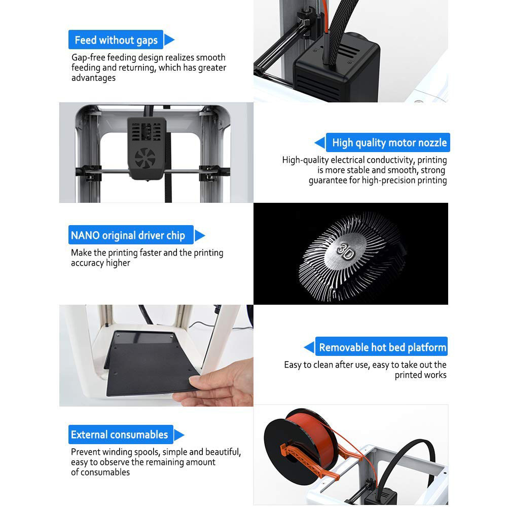 • Smooth And Beautiful Printing Effect: The NANO 3D Printer Supports A Print Size Of 95x110x110MM Mm, A PLA Filament Of 1.75 Mm ( Diameter ) And An Accuracy Of 0.05 Mm, Which Can Provide Smooth And Vivid Printing Quality. The Upgraded Extruder Technology Greatly Reduces The Problem Of Blocking And Makes Your Printing Smoother.