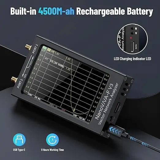 The NanoVNA-F V3 has a built-in 4500mAh Li-Ion battery that lasts for more than 5 hours. The charging port is USBType-C, which can be used for charging the device with the included Type-C cable, as well as for data transfer and firmware upgrade.
