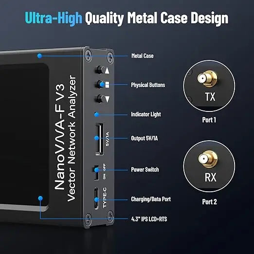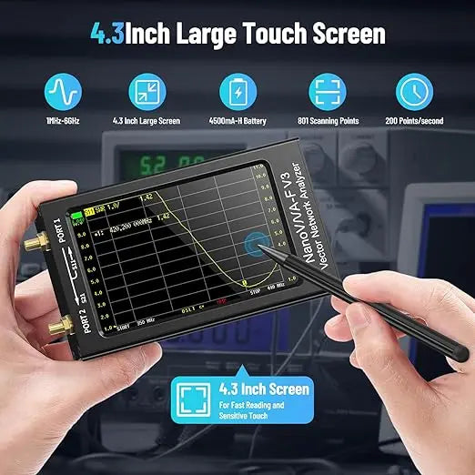The NanoVNA-F V3 is designed with an all-metal chassis for durability and shielding against electromagnetic interference. With dimensions of 125mm x 75mm x 20mm, the NanoVNA-F V3 is compact and portable. It is equipped with an SMA type RF connector and a high quality SMA extension cable for easy connection to various DUTs. Thanks to the optimized high-speed processing system, the NanoVNA-F V3 has a measurement speed of 200 points per second, and the maximum number of scanning points can be set to 801 points. The display is a 4.3" bright IPS resistive touch screen that is clearly visible in outdoor environments.