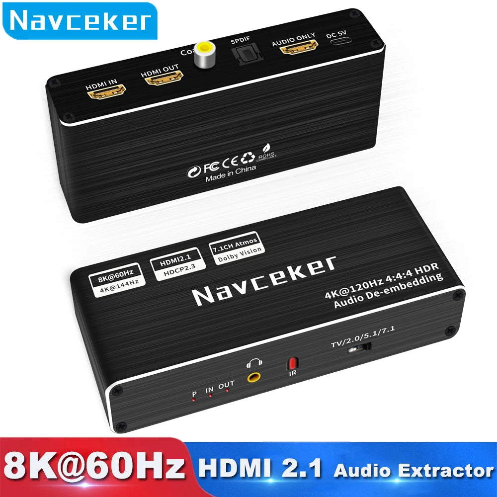 ZY-8V1,Navceker 4K 120Hz HDMI 2.1 Audio Extractor is a high performance 1 HDMI input and 1 HDMI output with HDMI audio out .HDMI AUDIO ONLY /Toslink/Coaxial/3.5mm jack audio output support audio extract function ,The system supports all 3D TV formats in addition to all HDTV formats up to 8K@60Hz,3840x2160@120Hz RGB 4 :4 :4 .