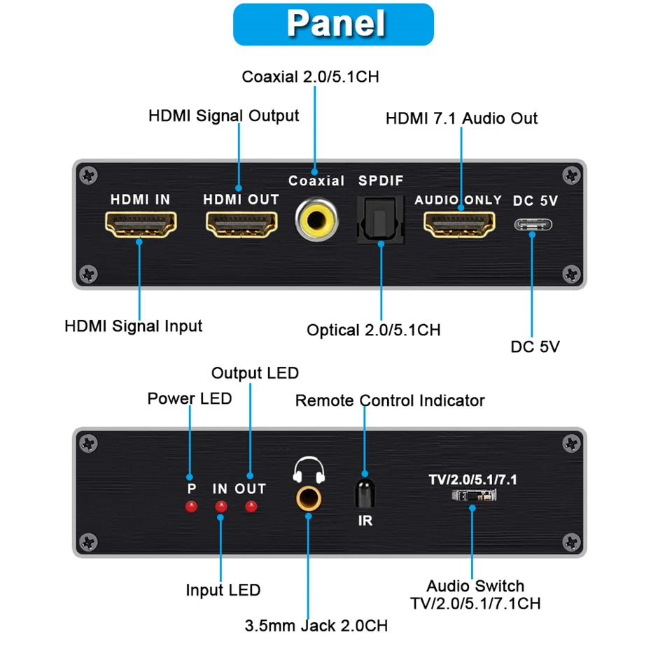 HDMI 2.1 Audio Extractor -with Optical TOSLINK SPDIF+Coaxial+3.5mm+HDMI audio out allow you to extract the sound from the HDMI input source (like PS5/4,Xbox one etc .)to your soundbar or amplifier ,no need connecting TV or Monitor .