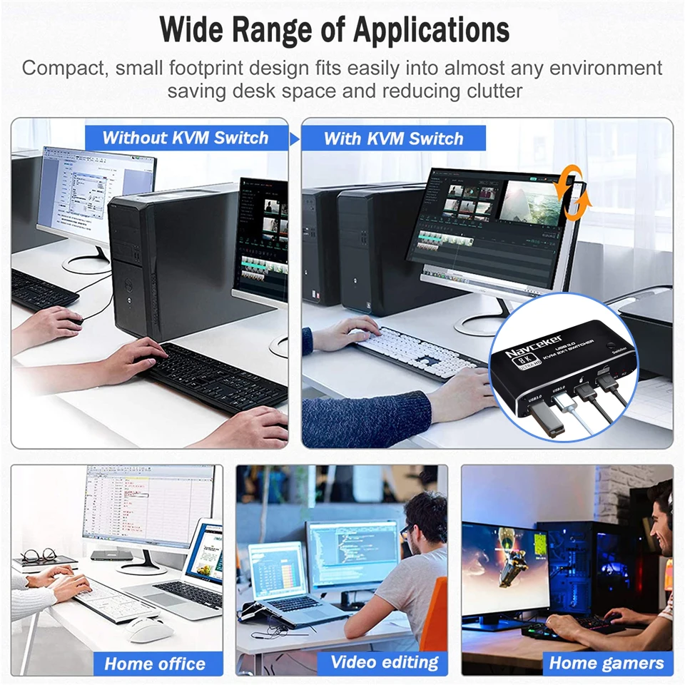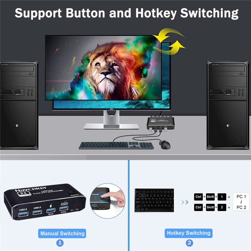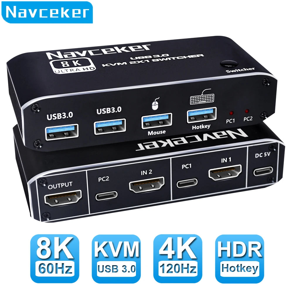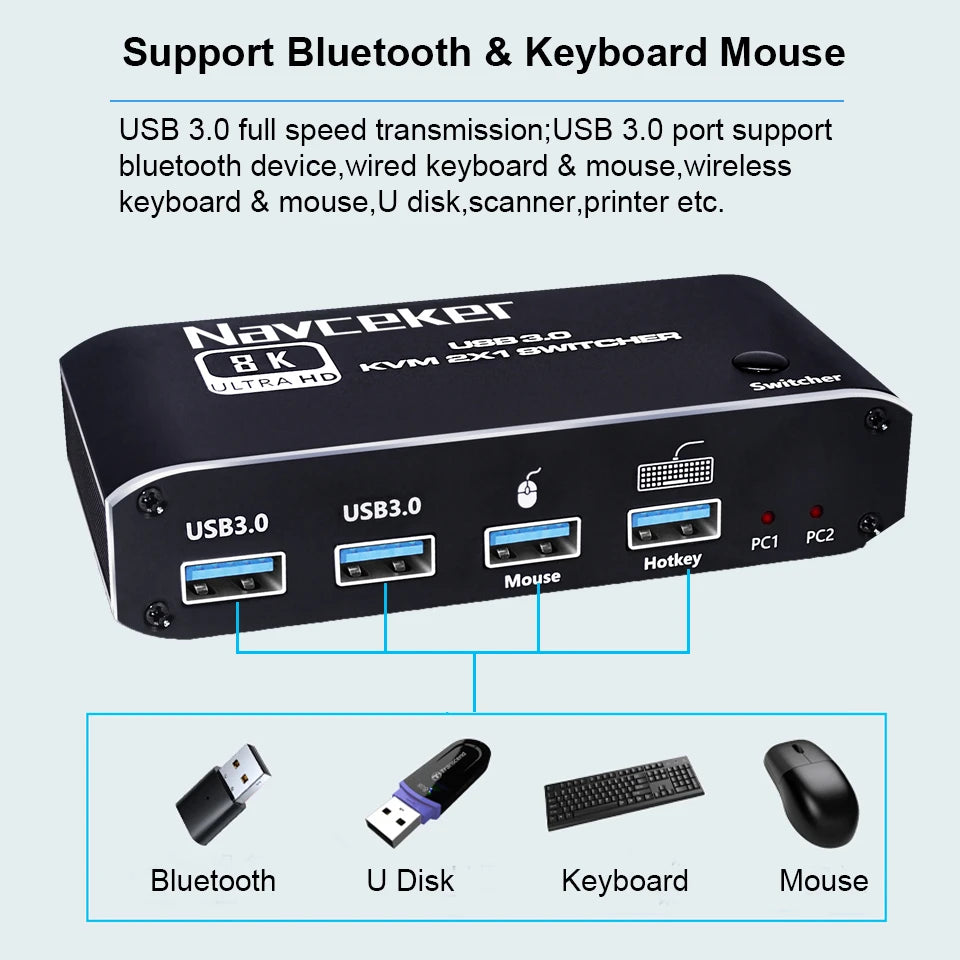 ZY-AK4,Navceker 8K HDMI USB KVM Switch allows you to share one USB keyboard, USB mouse,USB 3.0 device and one HDMI monitor to control 2 computers, laptops, game consoles.