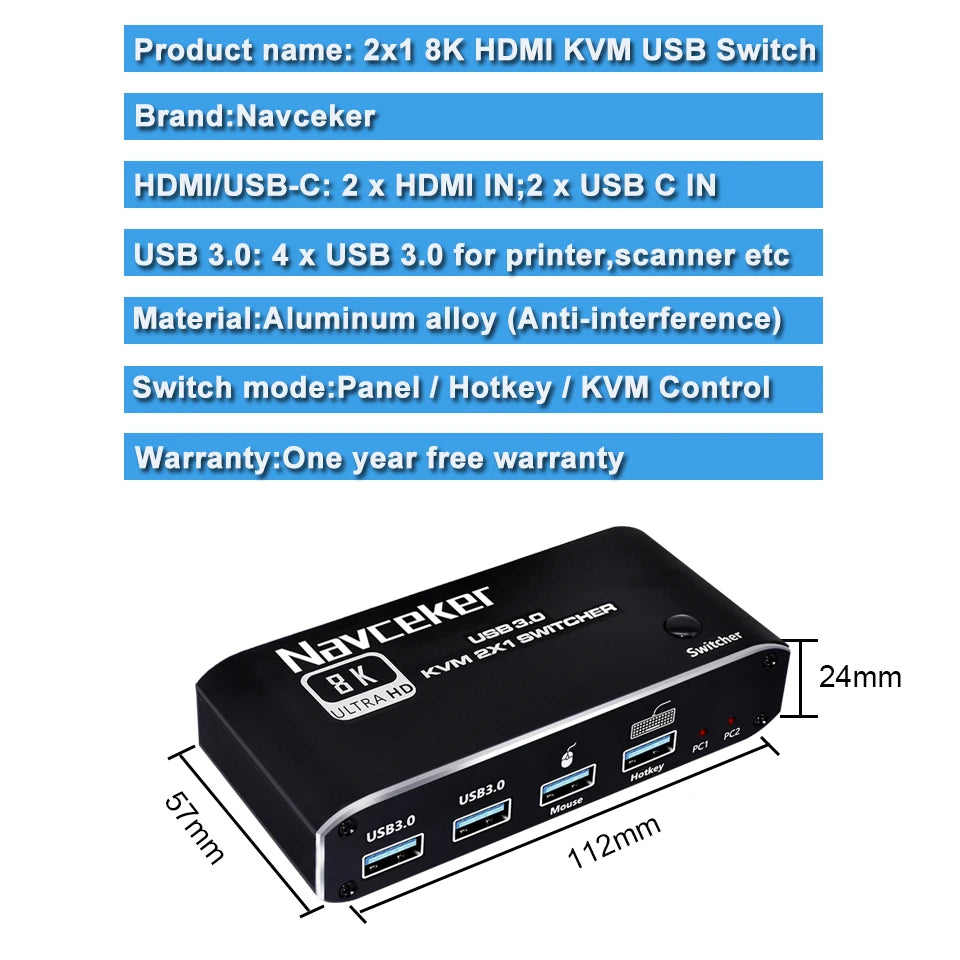 · What You Get: 1 x HDMI 2.1 KVM USB Switch, 2 x USB-C data cable, 1x USB power cable,1 x User Manual. Navceker ensures long-time satisfaction of your purchase, friendly and easy-to-reach customer service to solve your problems timely. If you have any problems, Please contact us we will slove immediately.