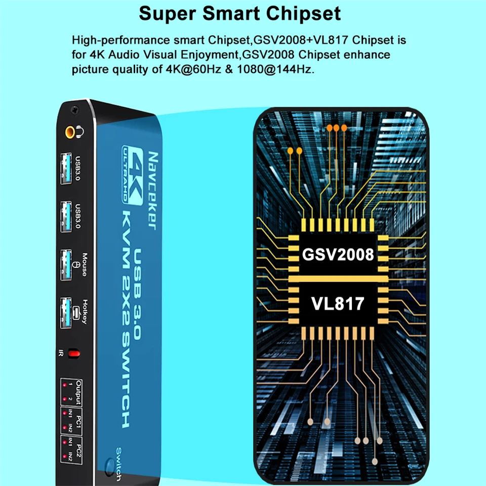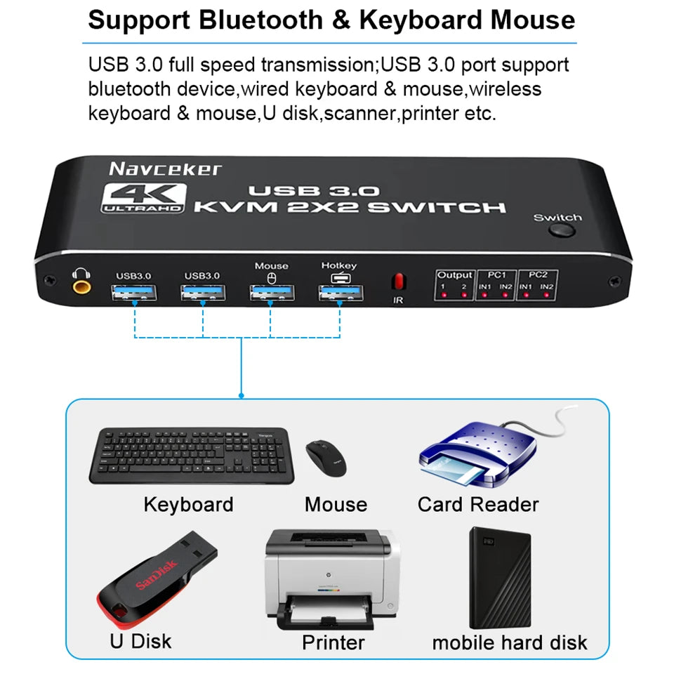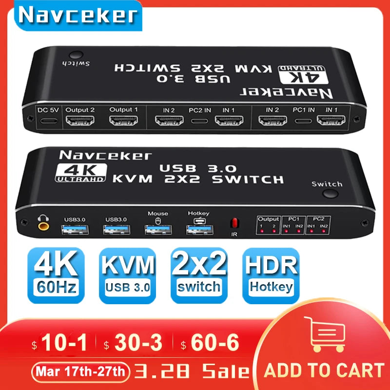 ZY-AK3,Navceker 4K 60Hz HDMI USB KVM Switch allows you to share one USB keyboard, USB mouse, and two HDMI monitor to control 2 computers, laptops, game consoles.