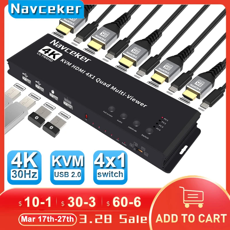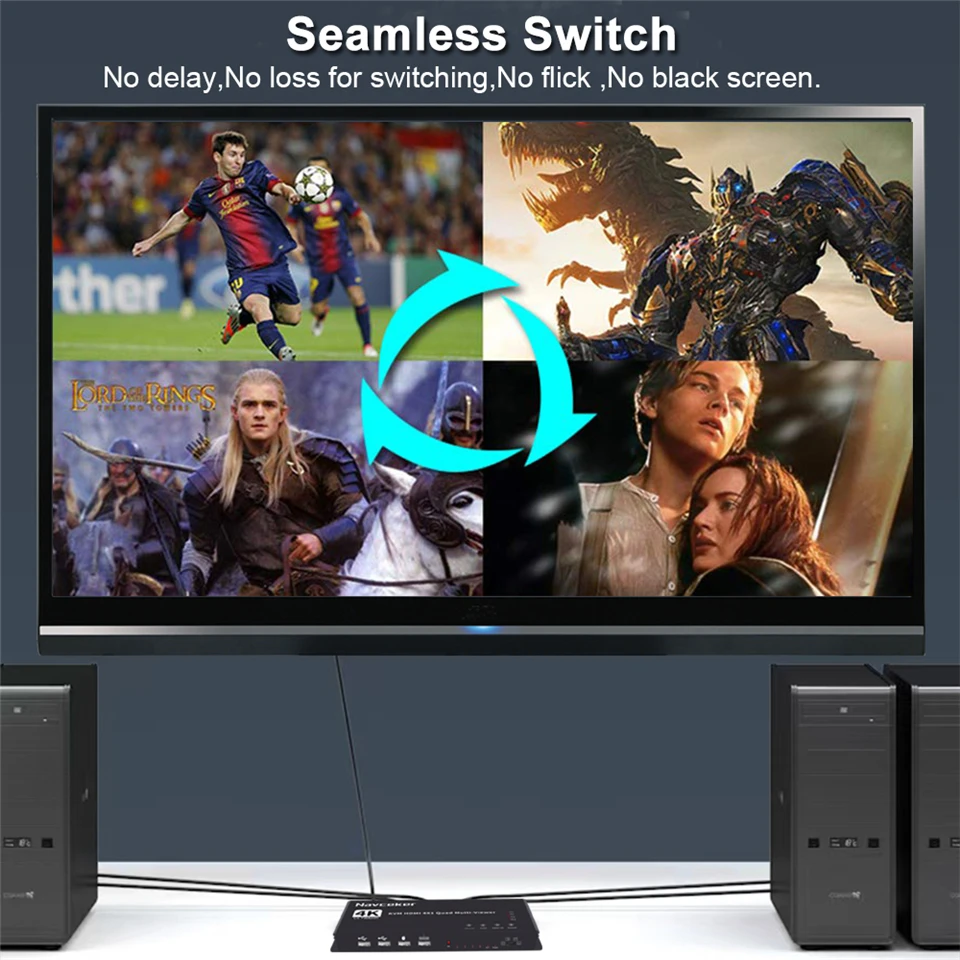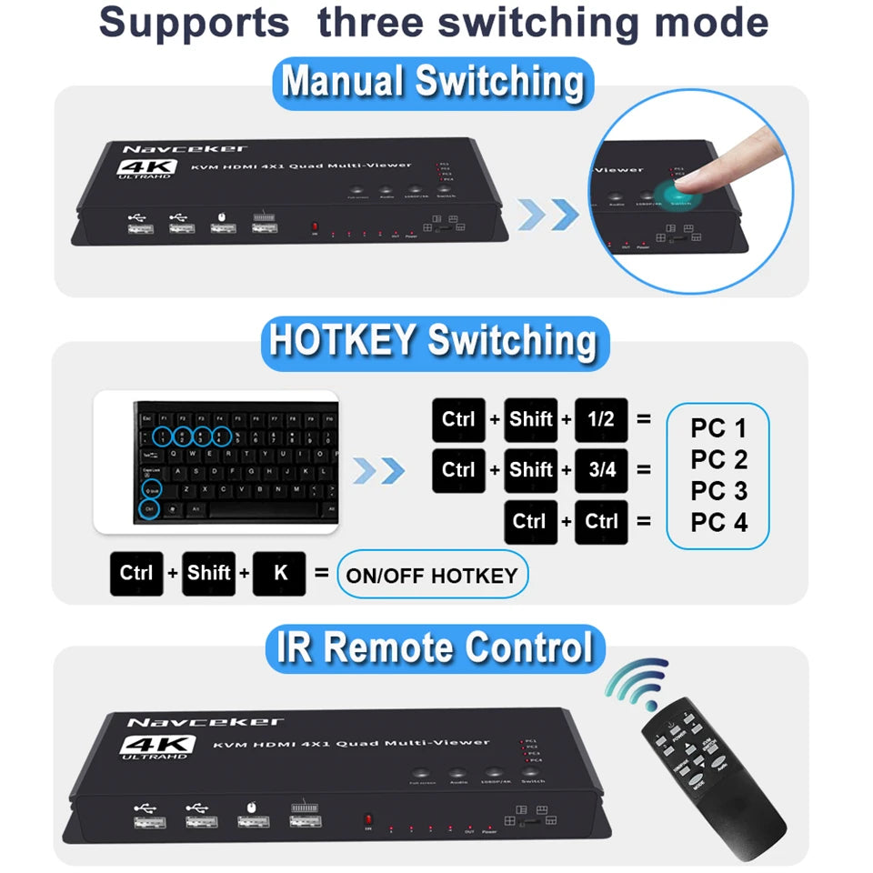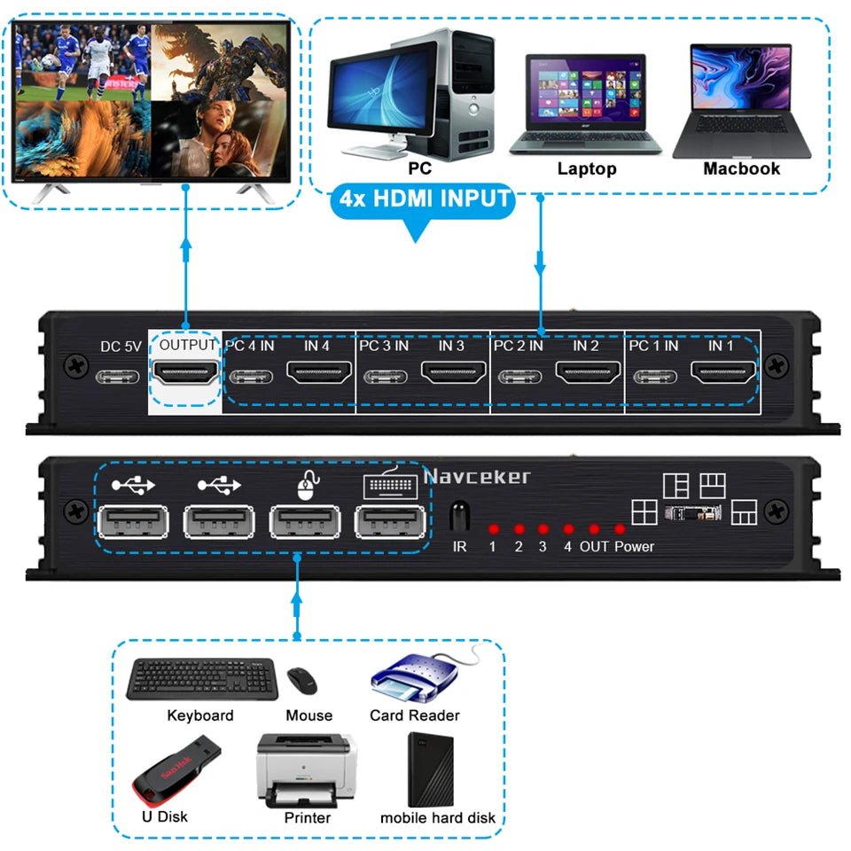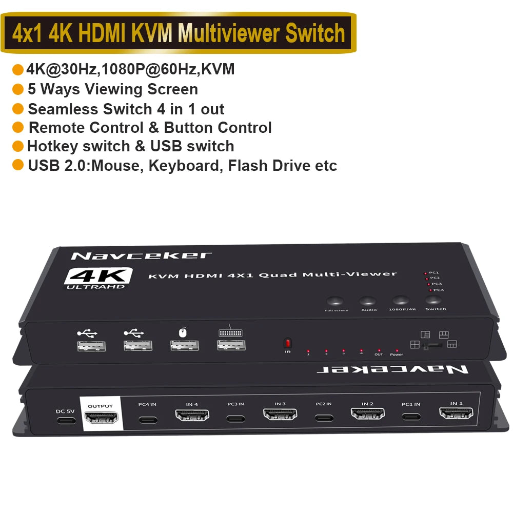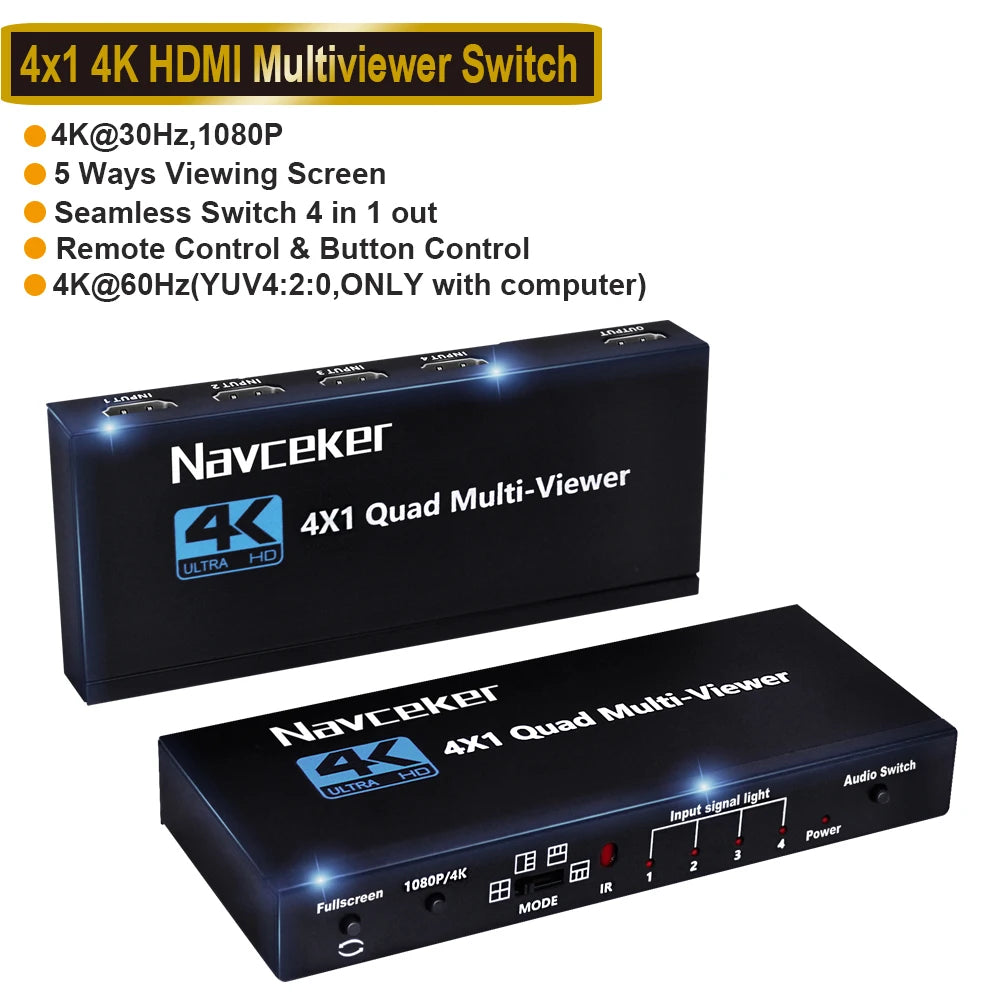 ZY-AK6,Navceker 4K HDMI 4x1 Quad KVM Multi-viewer is a high performance with four HD screen segmentation and seamless switching output switch. It can display 4 HD digital video signal on the same screen, and has a variety of video segmentation, seamless switching 4 HD input signal synchronously. The control methods of the switch is flexible, it can be switched via button , IR control and KVM control.It’s a very practical and stable switch and easy to install, can be used in the major projects, meeting halls and other places.