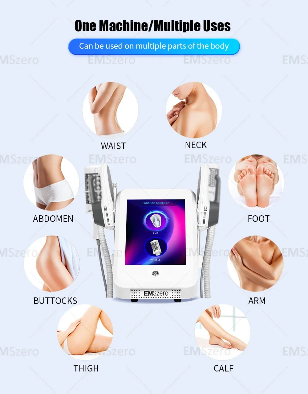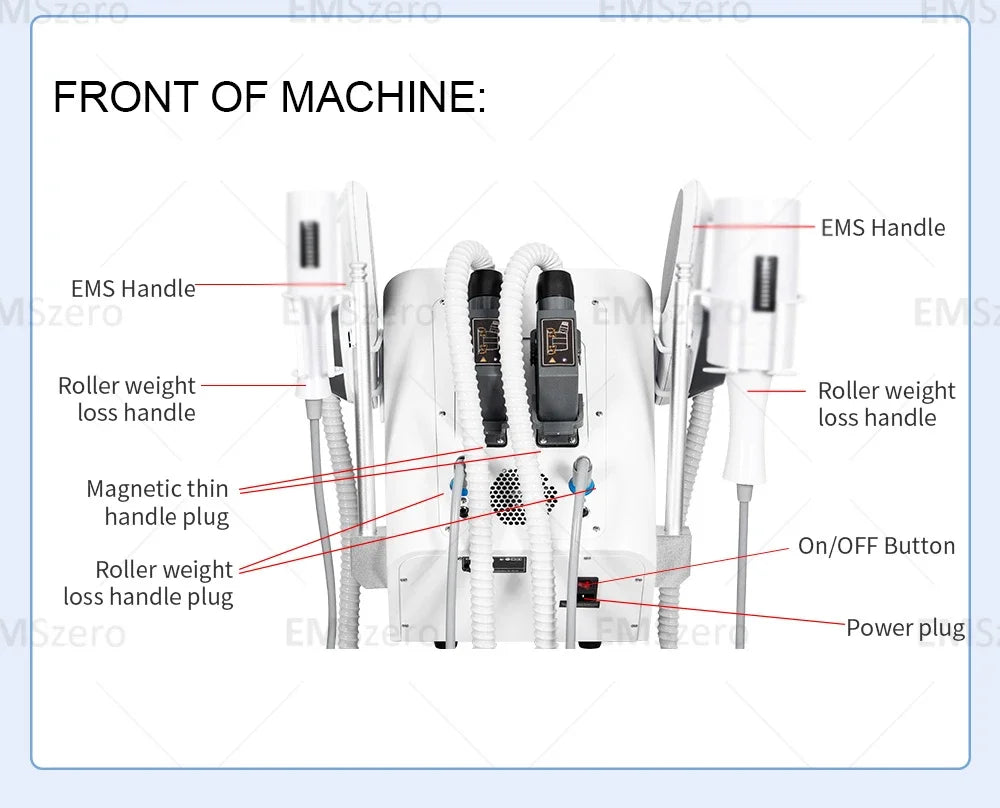 Ensure that the appearance of the EMSzero roller slimming machine is undamaged and the power connection is normal. Check if the roller and handle can rotate freely, and if all components are securely installed.