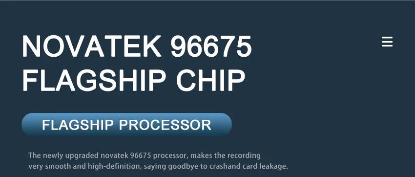 The newly upgraded novatek 96675 processor, makes the recording very smooth and high-definition, saying goodbye to crashand card leakage.