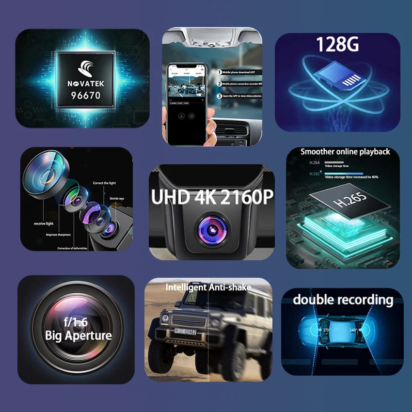 UHD 4K Video Combined with advanced Novatek chip + f/1.6 big aperture lens, dash cam delivers clearer videos up to 2160P resolution.