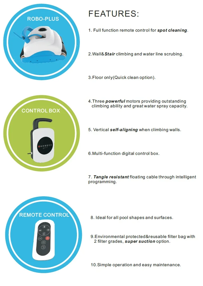 The swimming pool cleaner robot is a new type of effective cleaning equipment independently developed by our company. It has three parts, the cleaning machine, the power console and the control panel. The cleaning machine is controlled by computer and thoroughly scrubs the bottom and sides of the pool which continuously filtering water. It does not need to change water after cleaning utterly changes the traditional way of pool cleaning, which not only saves physical labor and expensive costs but also valuable water resources. The product originates at home and takes a lead in the world as a result of its high performance and cost ratio.