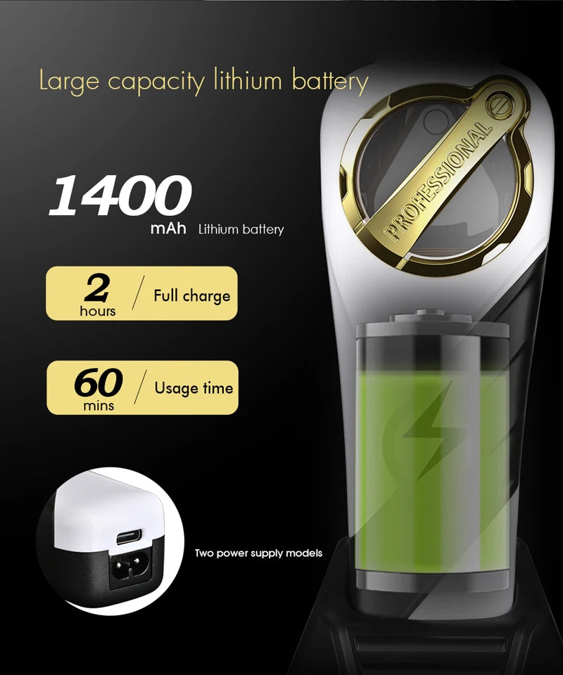 ● Lithium battery: 1400 mAh, fully charged for 2 hours, about 60 minutes of use.