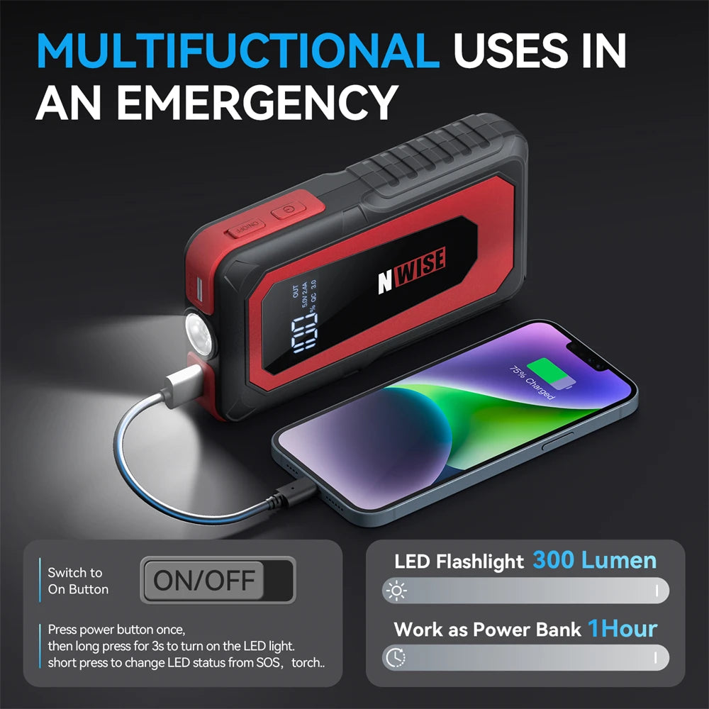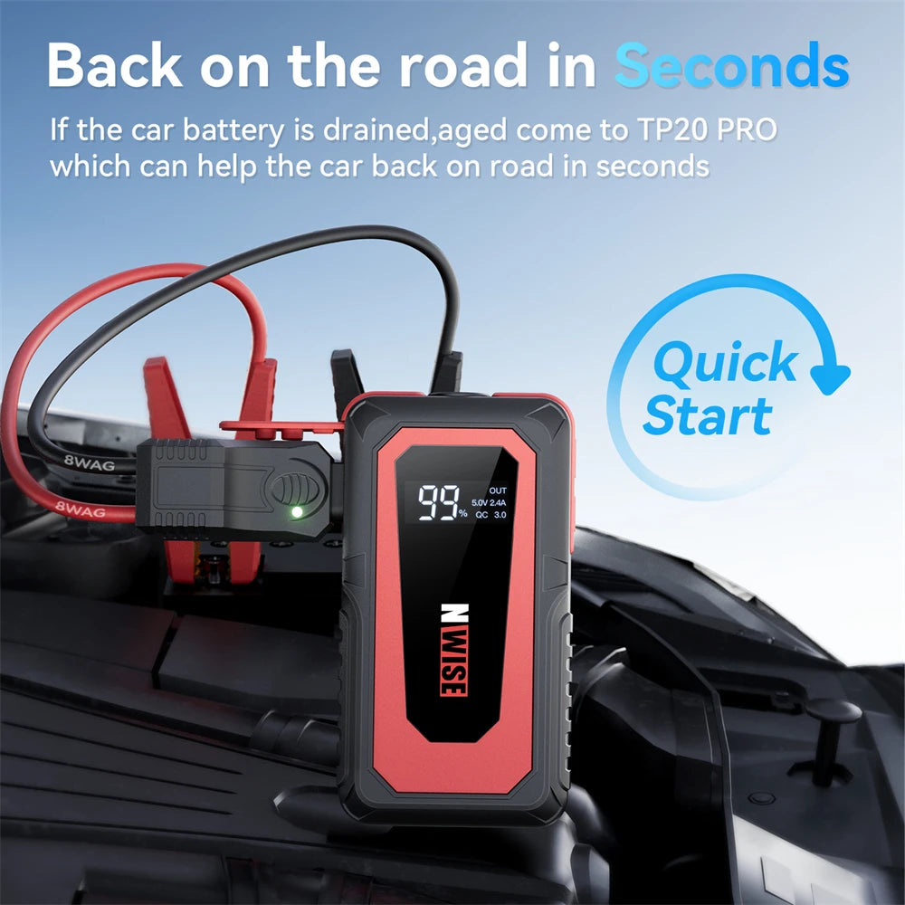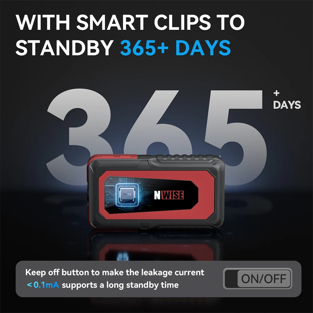 NWISE TP20PRO Jump Starter for vehicles works with smart jumper clamp which provides 10 safety protections to ensure it's safe to use,The red/green indicator and audible buzz prompting whether it is used correctly.